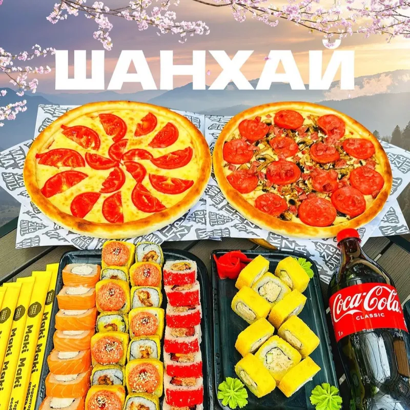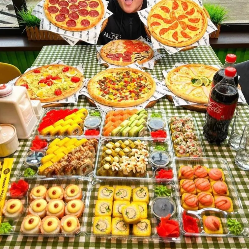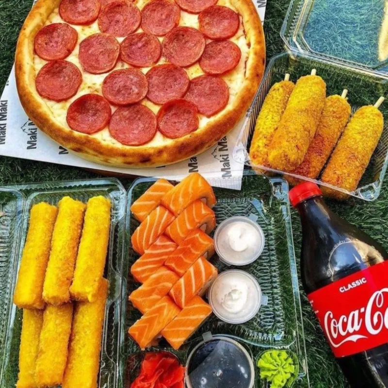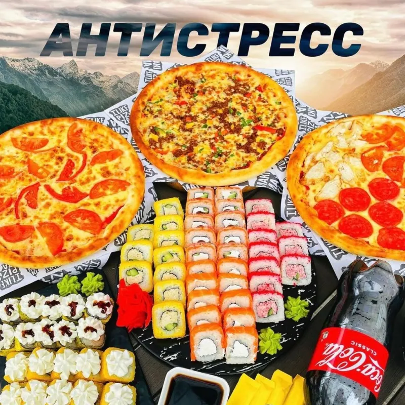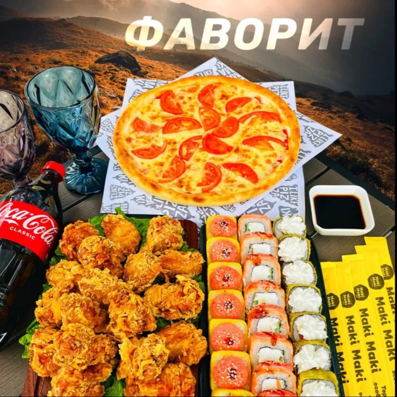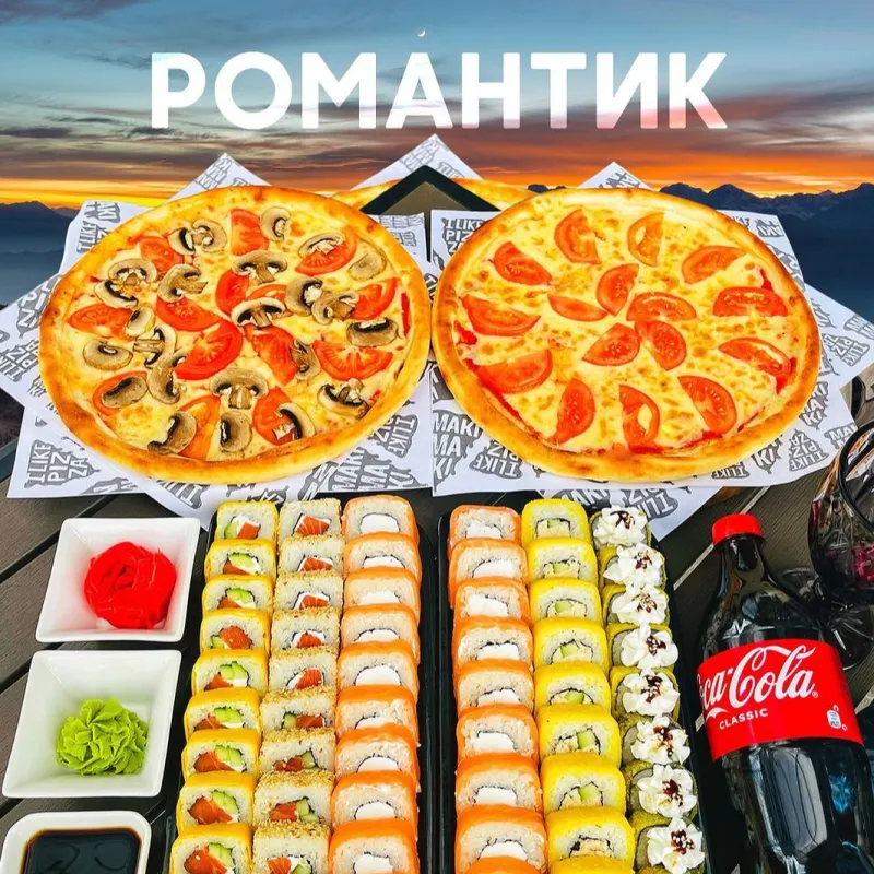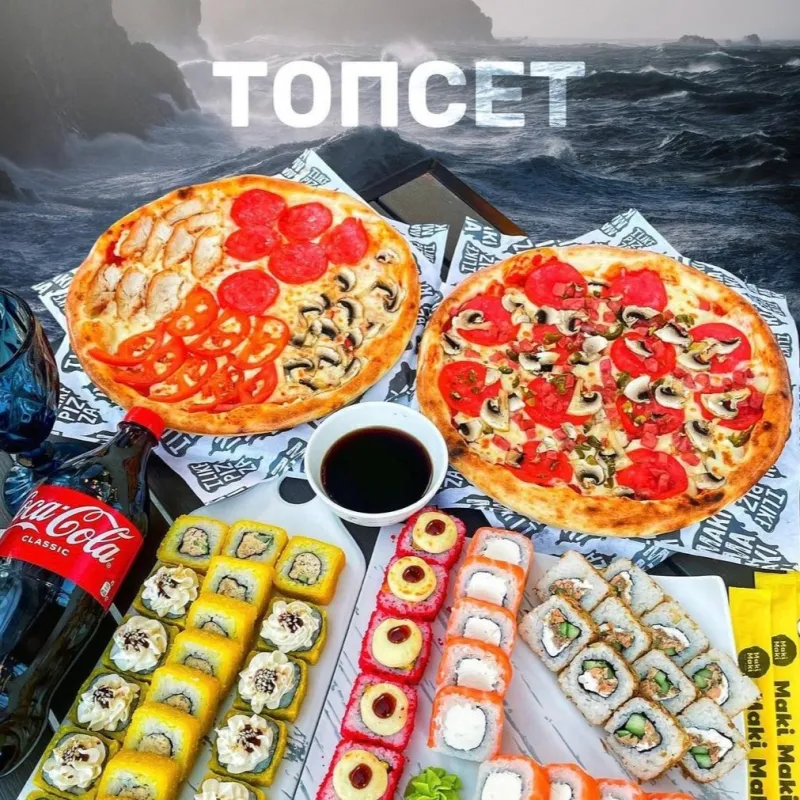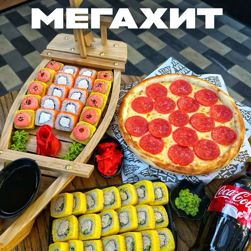 Филадельфия х2; Лосось темпура; Америка; Цезарь х2; Бонита; Ташими; Томато; Калифорния; Пицца Маргарита; Пицца Пепперони; Пицца куриная; Coca-Cola 2 л.
