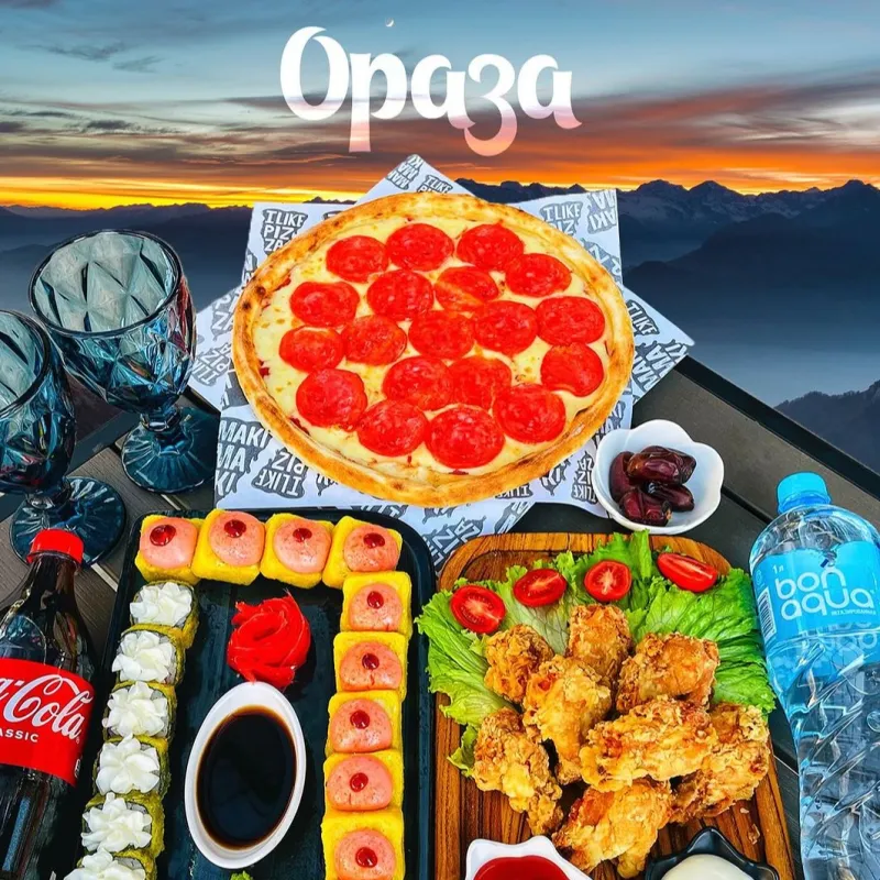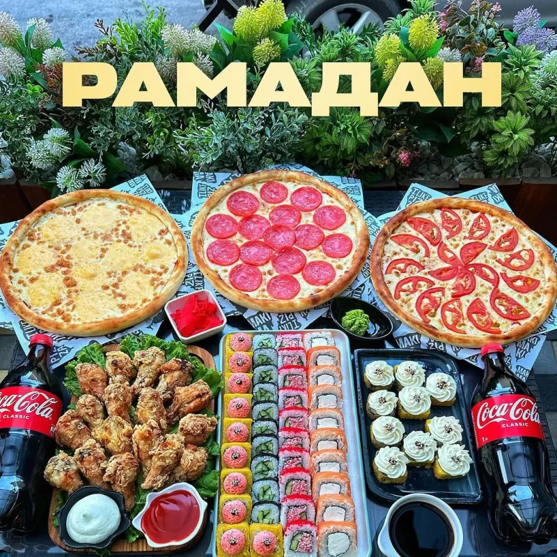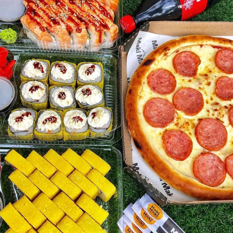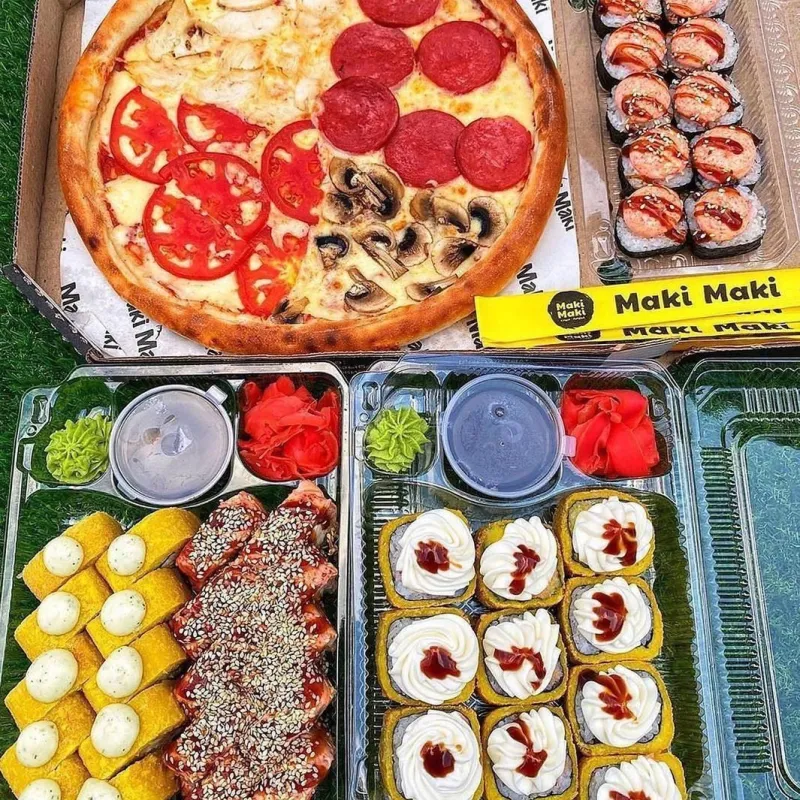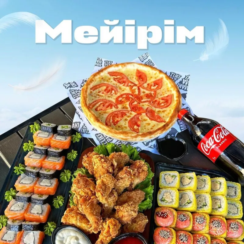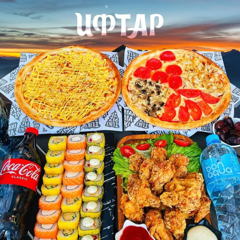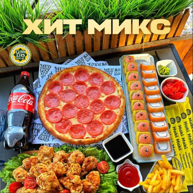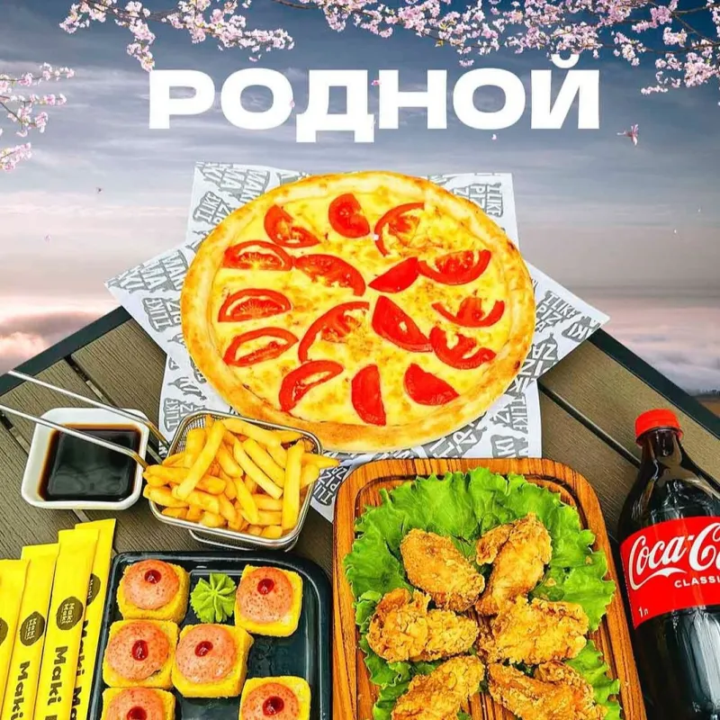 Филадельфия х2; Лосось темпура; Америка; Цезарь х2; Бонита; Ташими; Томато; Калифорния; Пицца Маргарита; Пицца Пепперони; Пицца куриная; Coca-Cola 2 л.