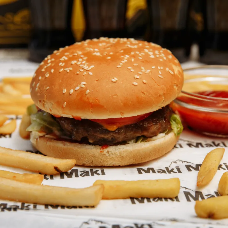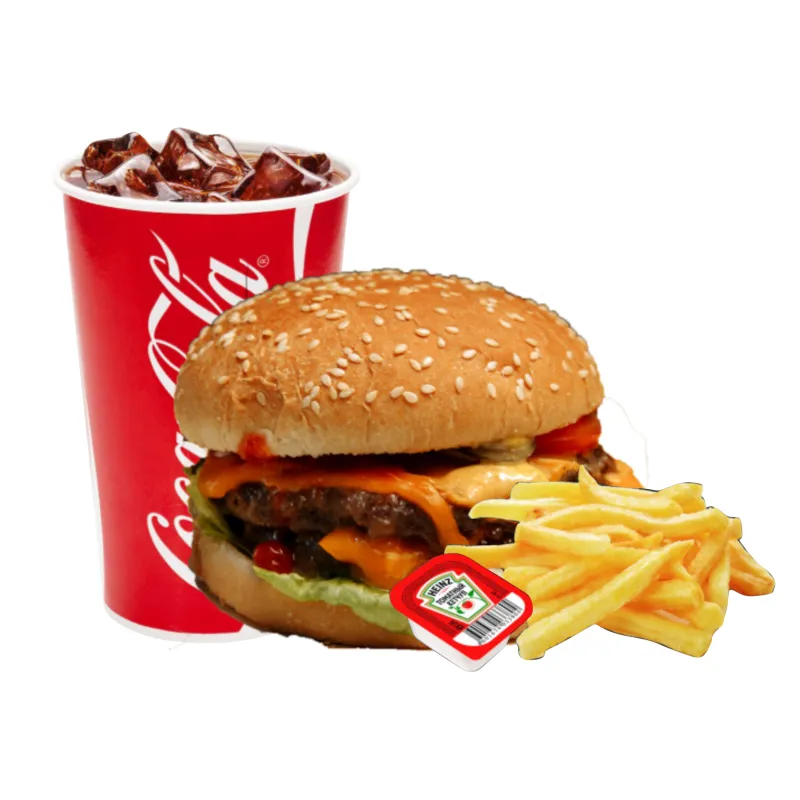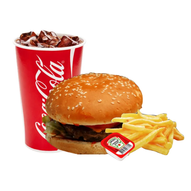 Бургер с говядиной; Фри 250 гр.; Соус кетчуп "Heinz", Coca-Cola на разлив 0,4 л.