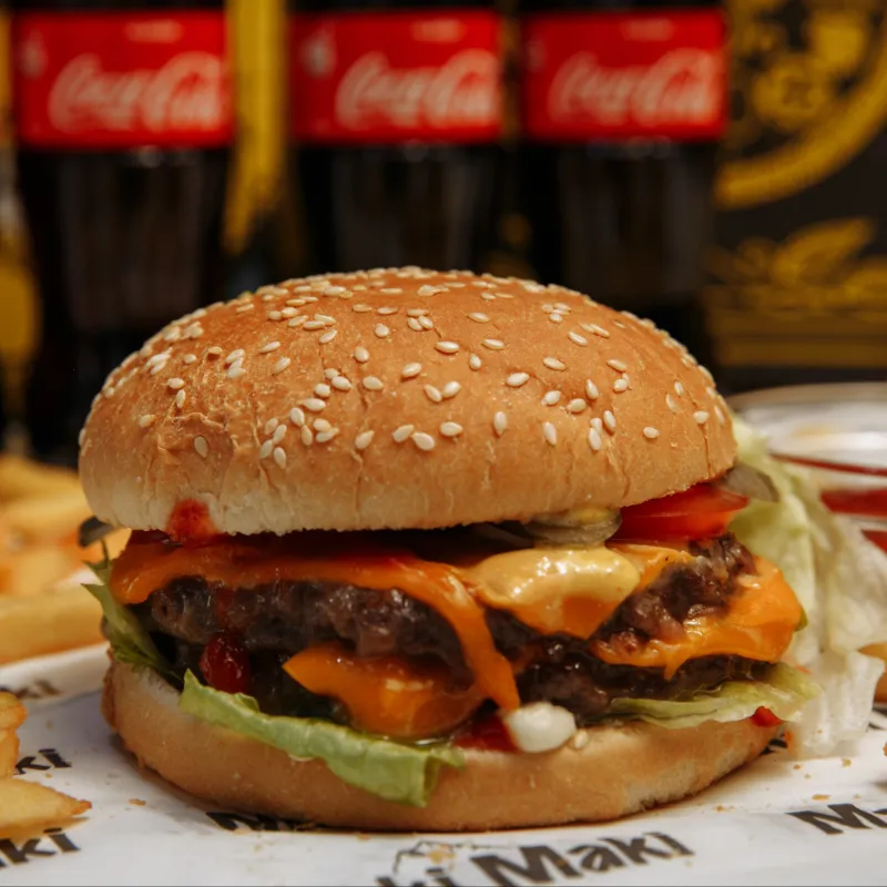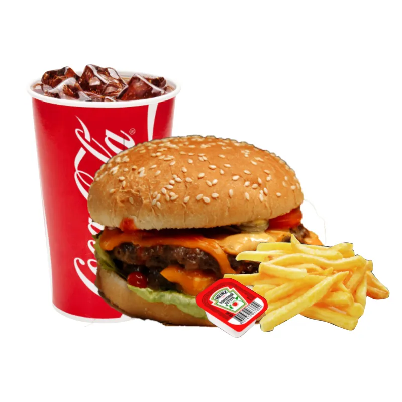 Двойной бургер с говядиной; Фри 250 гр.; Соус кетчуп "Heinz", Coca-Cola на разлив 0,4 л.