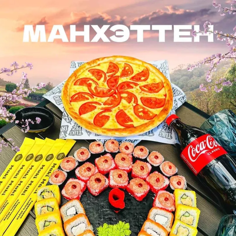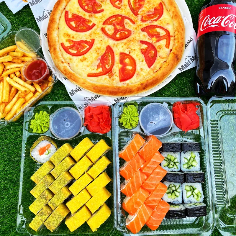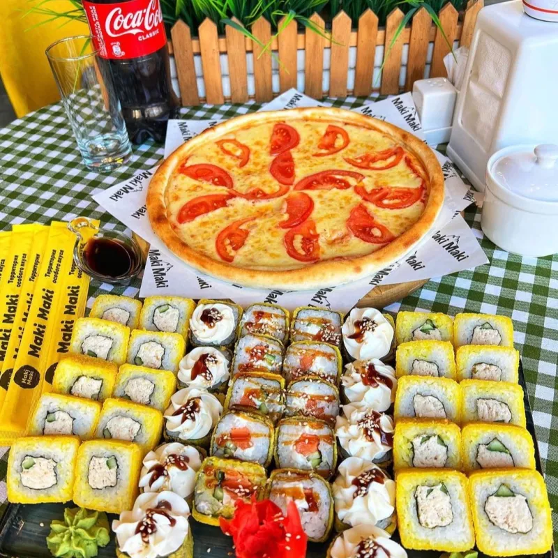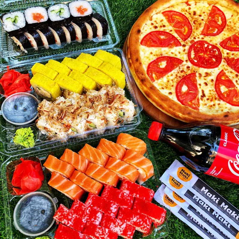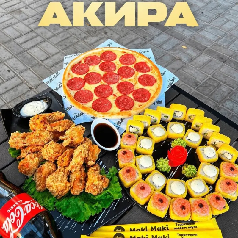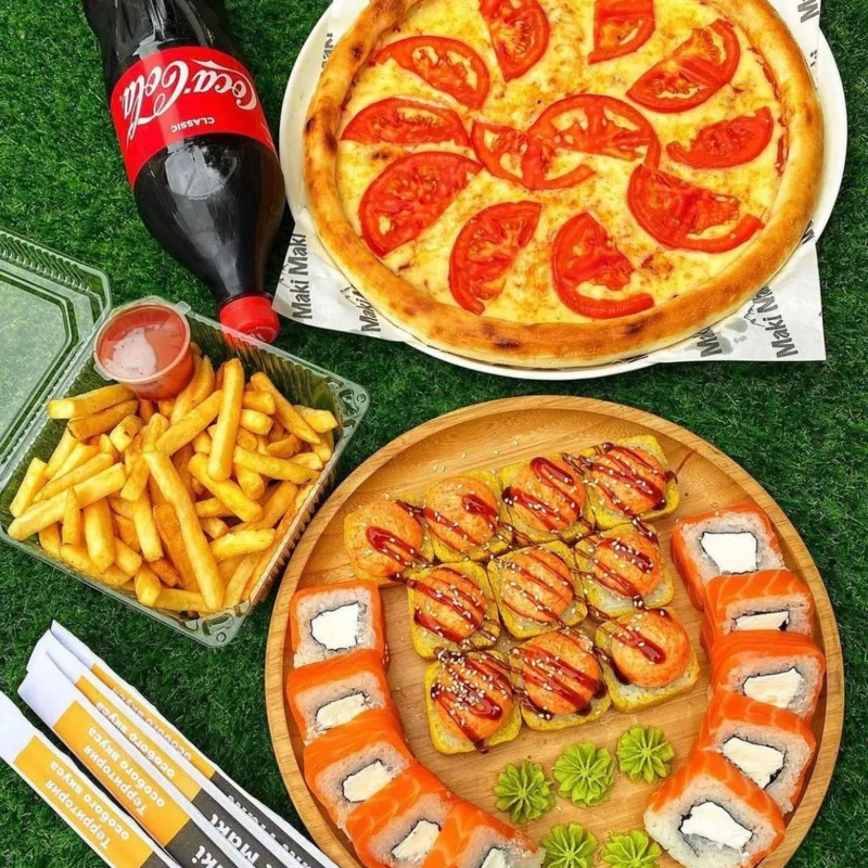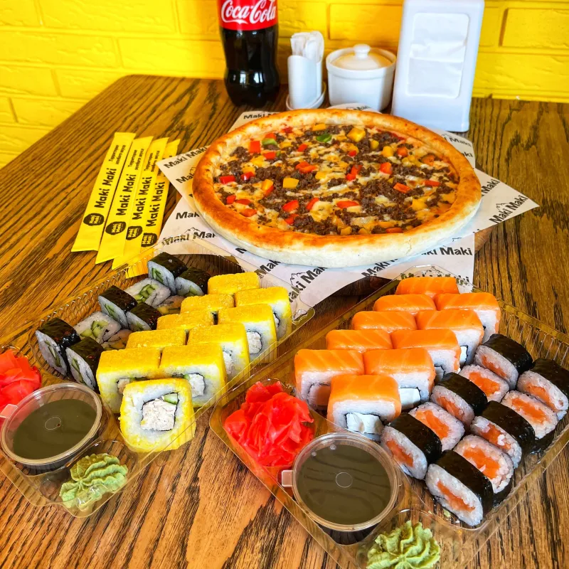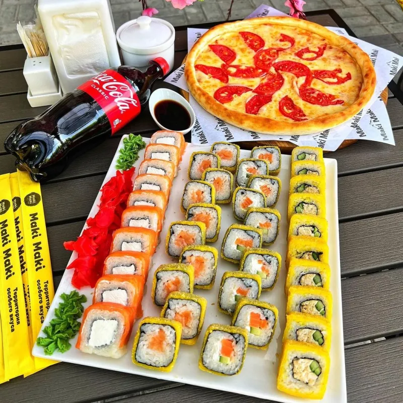 Филадельфия; Калифорния; Сяке маки; Бонита маки; Каппа маки; Пицца Маргарита; Цезарь; Coca-Cola 1 л.