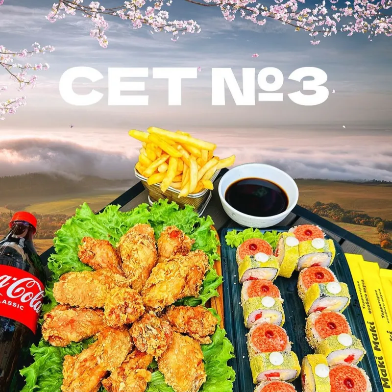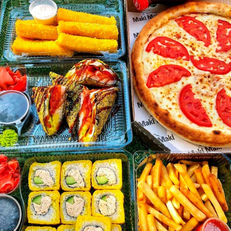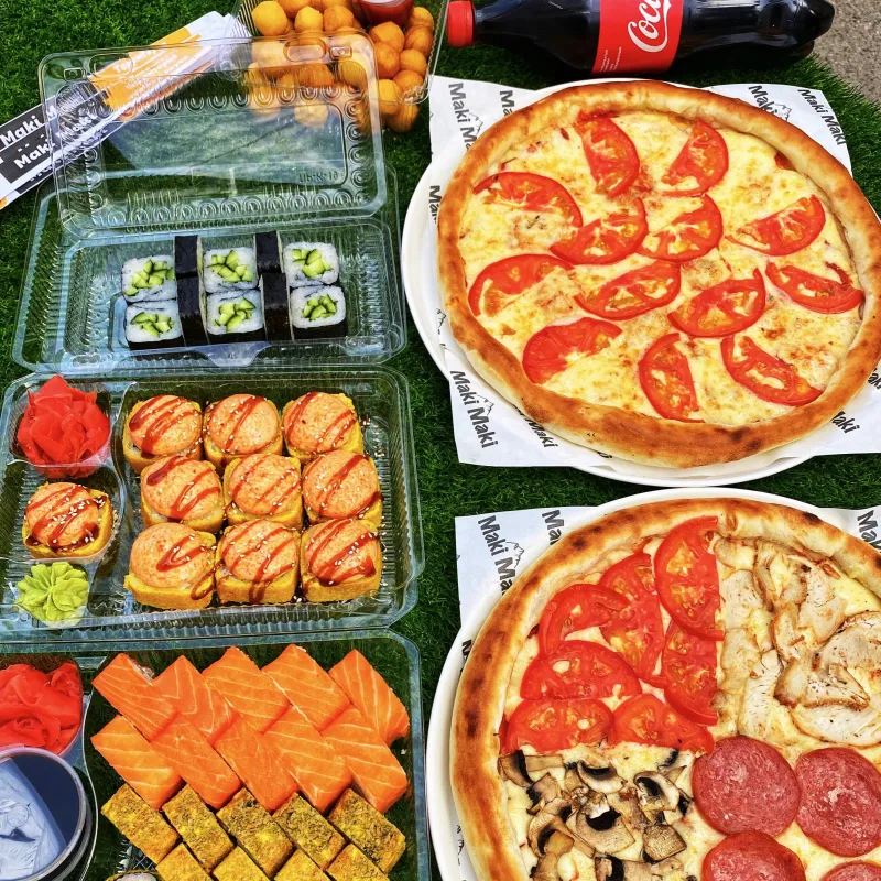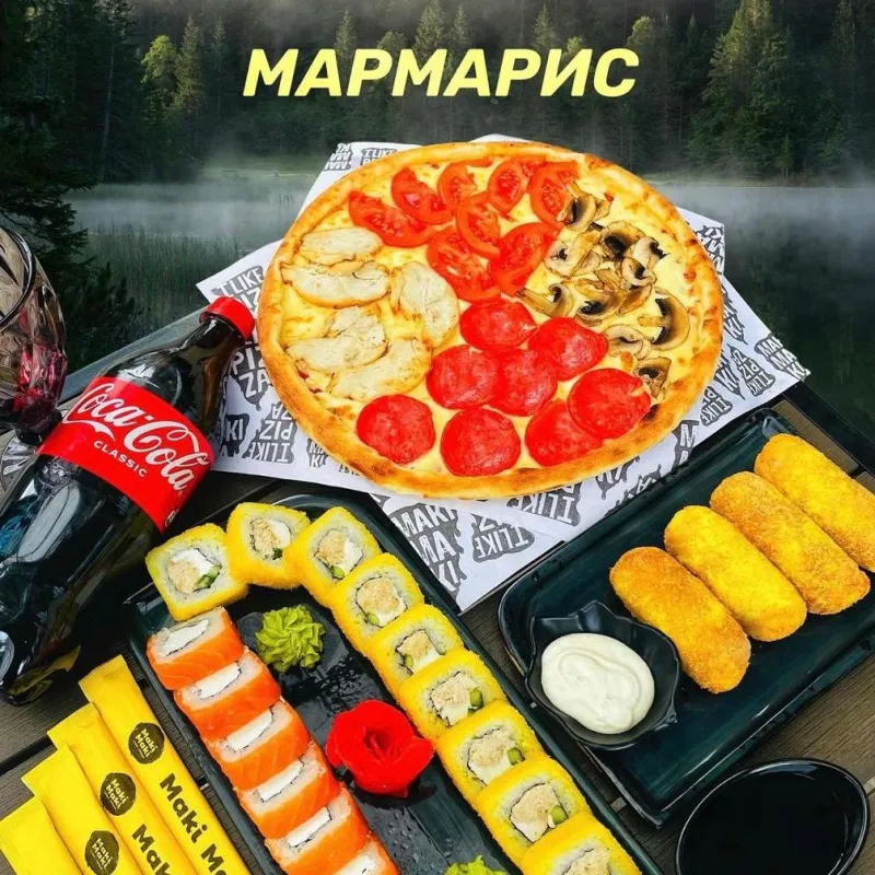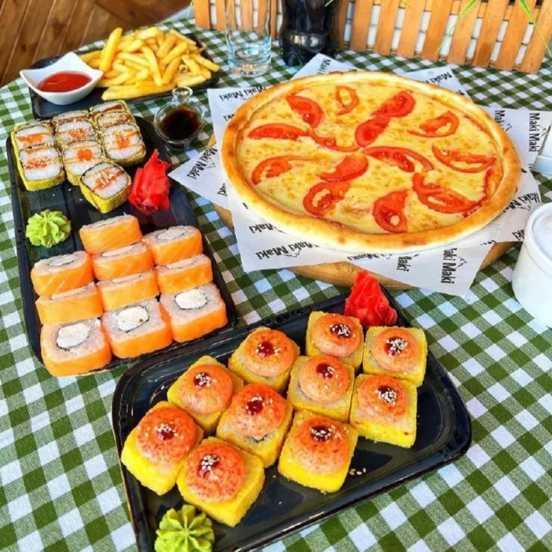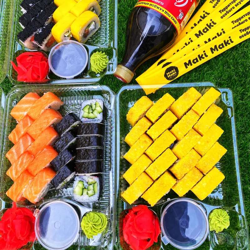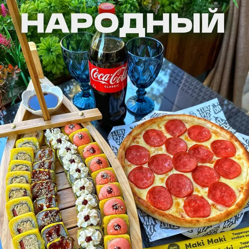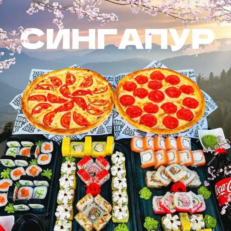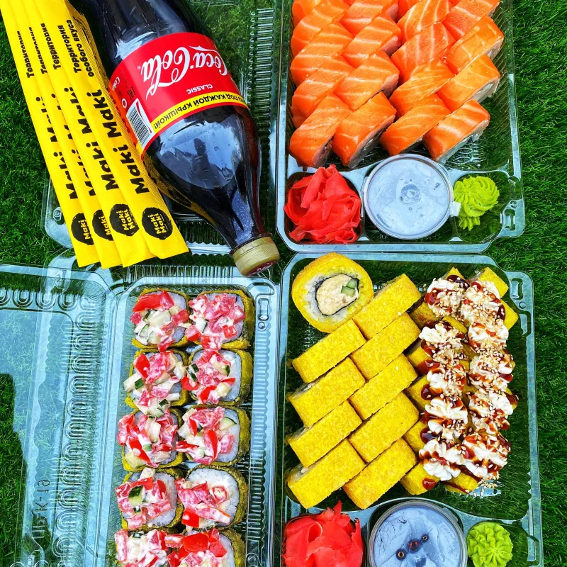 Филадельфия; Калифорния; Сяке маки; Бонита маки; Каппа маки; Пицца Маргарита; Цезарь; Coca-Cola 1 л.