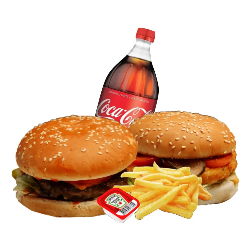 Бургер на выбор - 2 (с говядиной / с курицей); Фри 250 гр.; Соус кетчуп "Heinz"; Coca-Cola 1 л.
