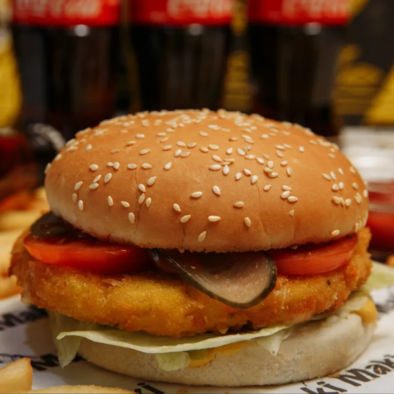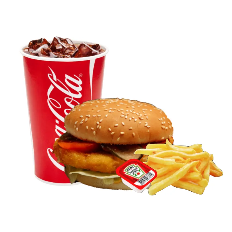 Бургер с курицей; Фри 250 гр.; Соус кетчуп "Heinz"; Coca-Cola на разлив 0,4 л.