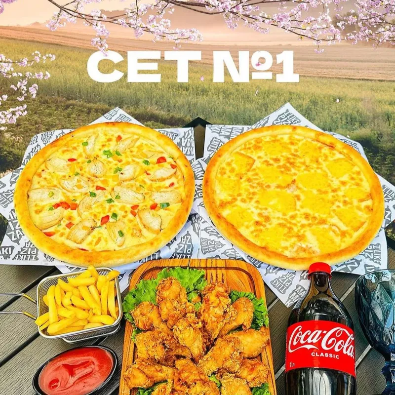Крылышки 16 шт.; Пицца Куриная; Пицца Сырная; Фри 250 гр.; Coca-Cola 1 л.