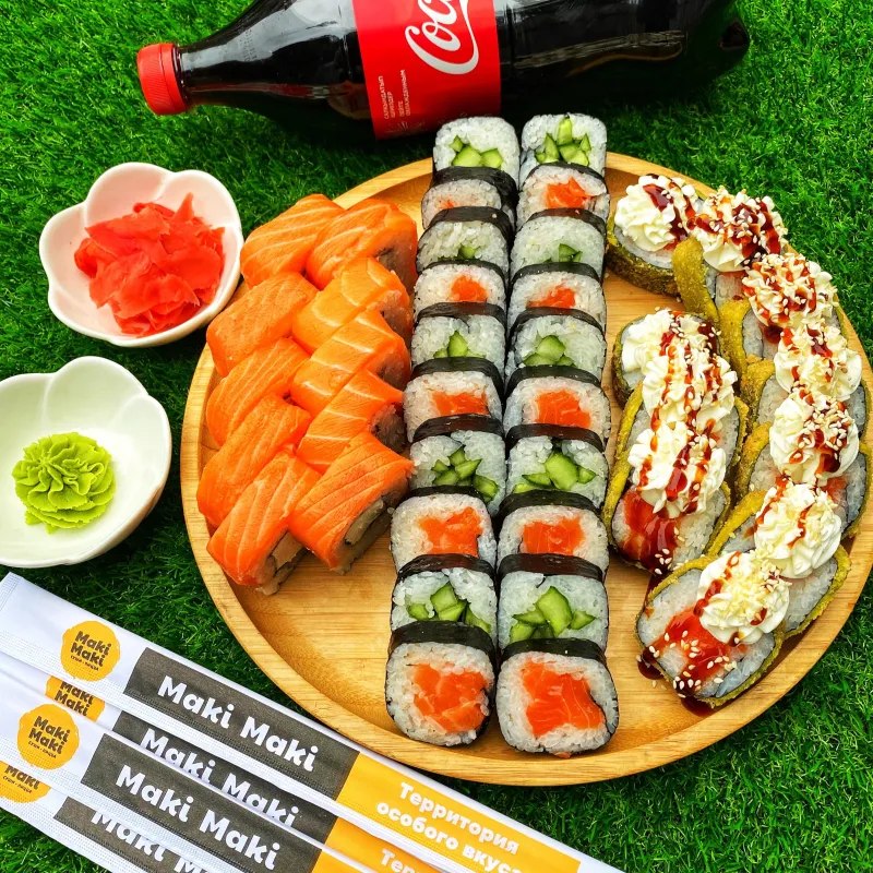 Филадельфия; Лосось темпура; Каппа маки; Сяке ролл с лососем; Coca-Cola 1 л.