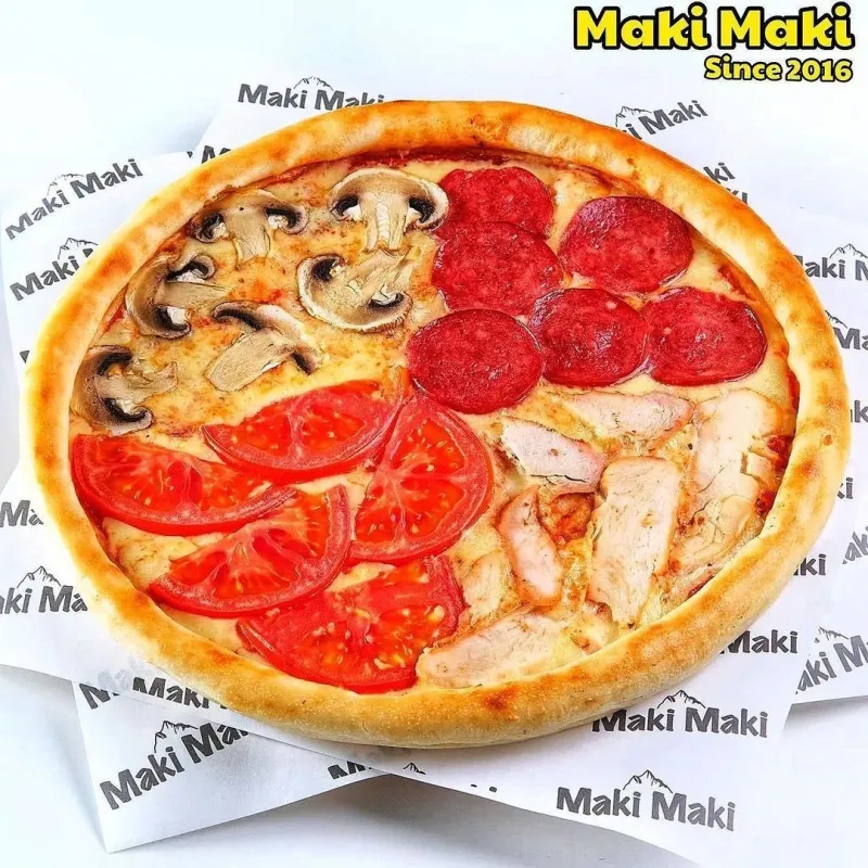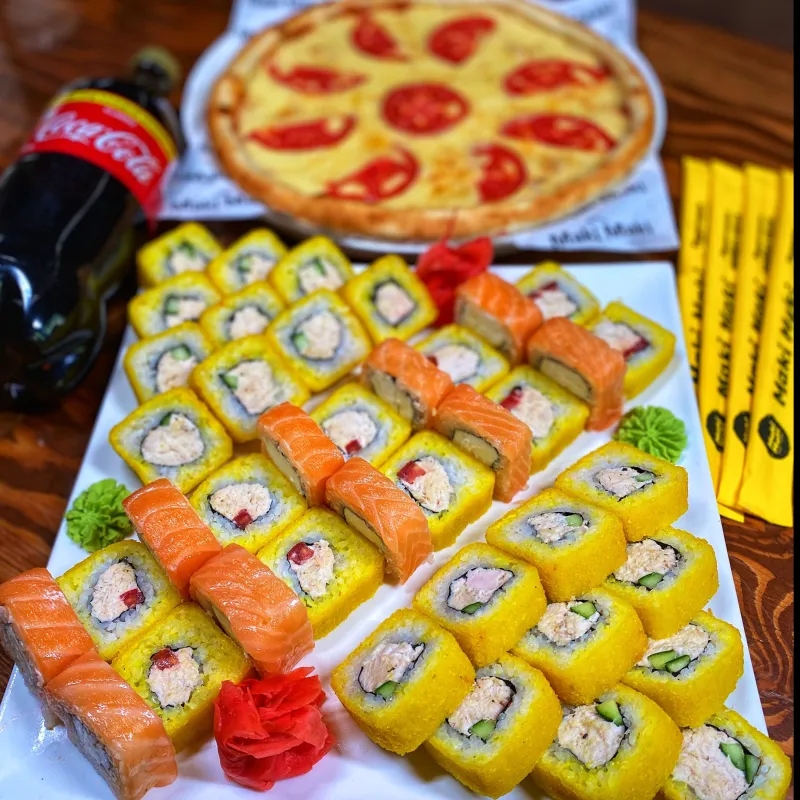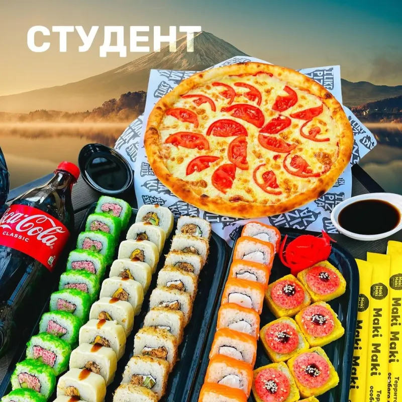 Филадельфия 10 шт.; Эби темпура 10 шт.; Поцелуй Гейши 10 шт.; Лосось темпура 10 шт.; Цезарь 10 шт.; Калифорния 10 шт.; Каппа маки 10 шт.; Пицца "Маргарита"; Пицца "4 сезона"; Пицца "Болоньезе со светофором" + Coca-Cola 1 л. в подарок