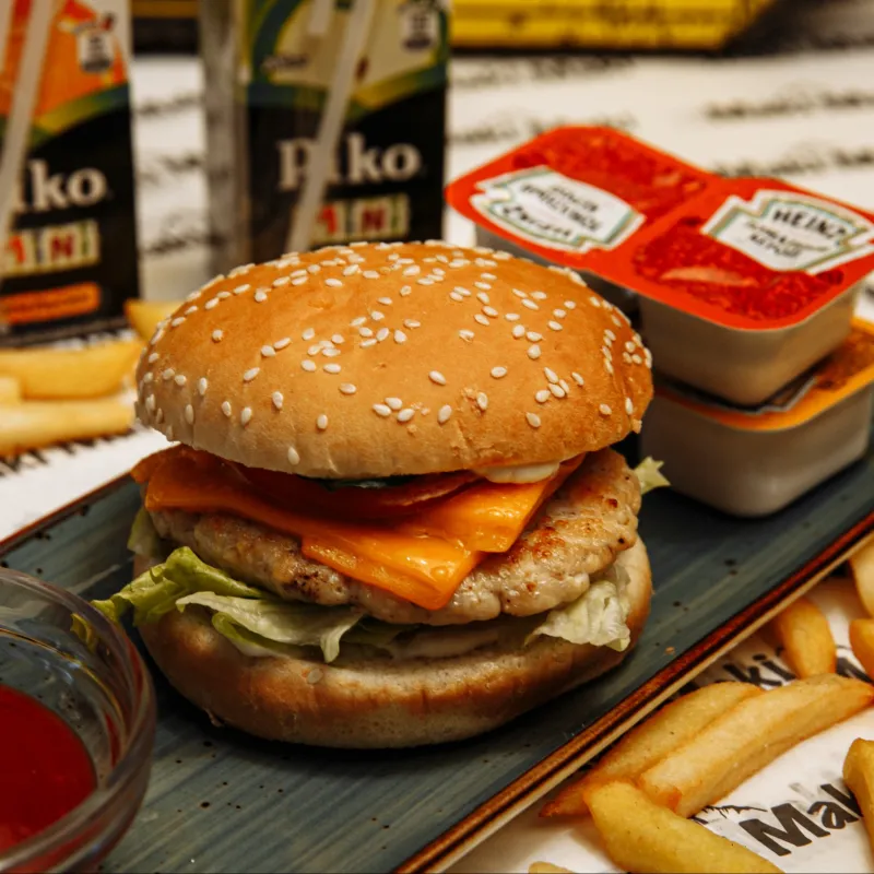 (свежая булочка, котлета куриная, огурцы, помидоры., айсберг, кетчуп, майонез, сыр плавленный)