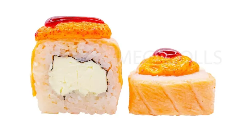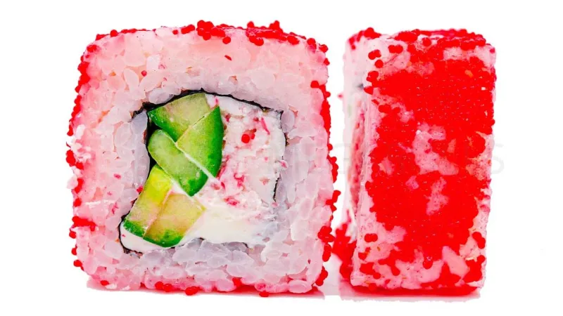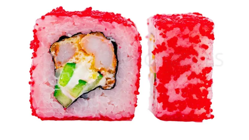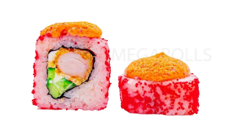 Креветка · икра тобико · сыр фила · огурец · соус лава