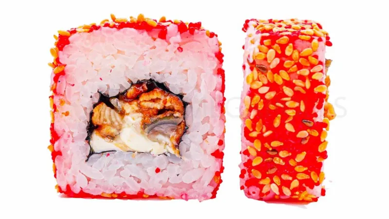Икра тобико · угорь · сыр филадельфия · кунжут