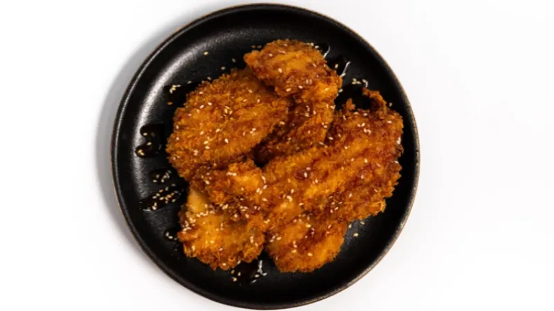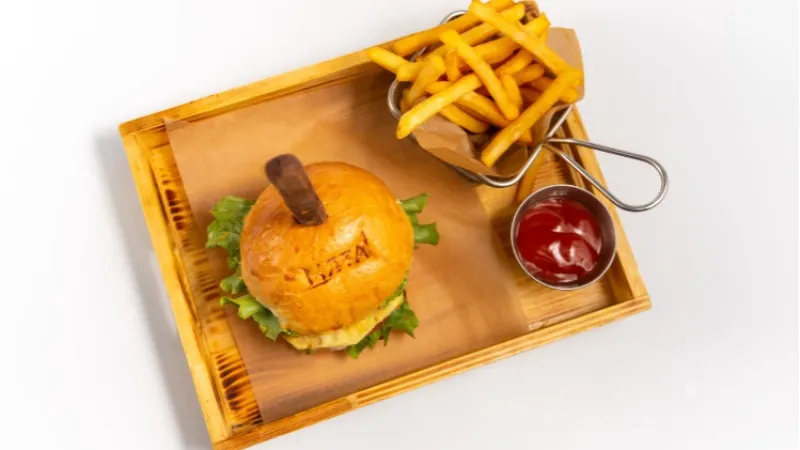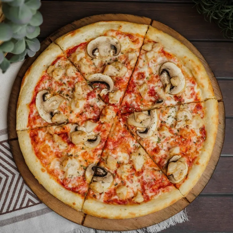 Куриная котлета, сыр чеддер, лук, жареные шампиньоны, лук и лист салата