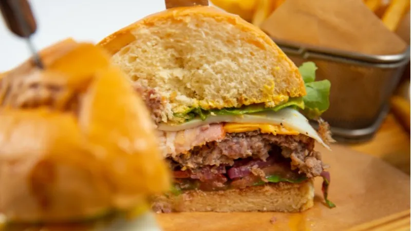Говяжья котлета, бекон, сыр чеддер, свежие помидоры, лук маринованный, халапеньо, лист салата