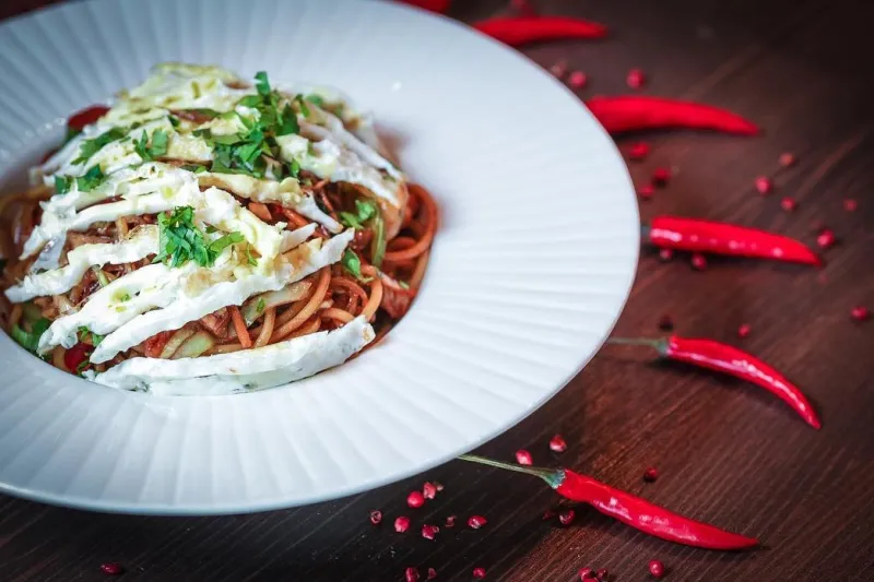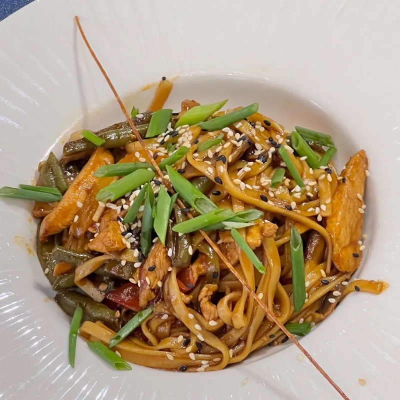(филе курицы,шампиньоны,лук репчатый заправленной в сливочном соусе,паста,пармезан)