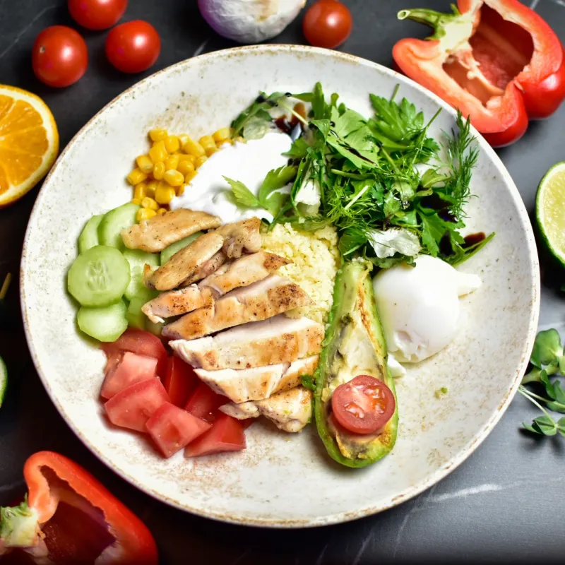 Куриное грудка,свежие овощи,помидоры черри,яйцо,сметана,авокадо,микс салата,бальзамическая заправка