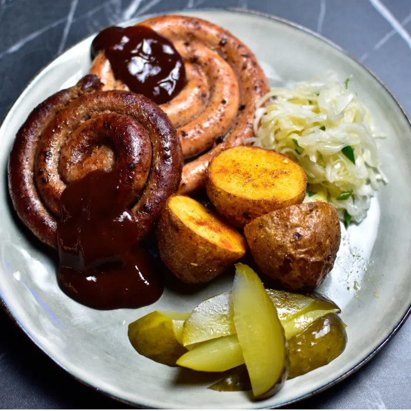 Колбаски куриные,колбаски говяжие,картофель запеченный,соус барбекю