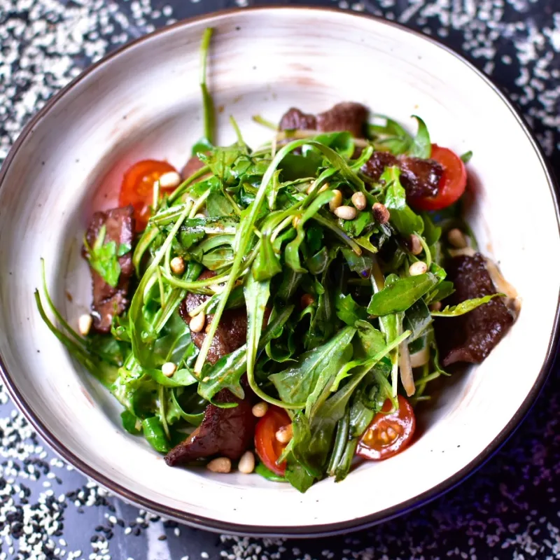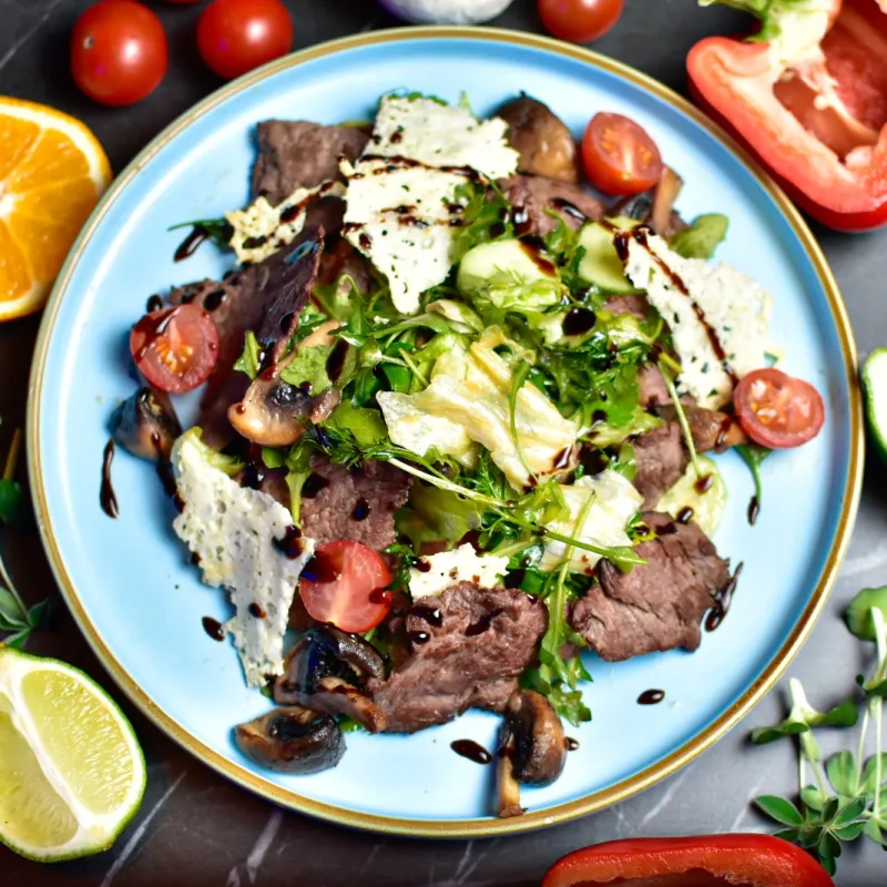 Классический итальянский салат на основе слайсов говядины помидоров черри и хрустящей рукколы