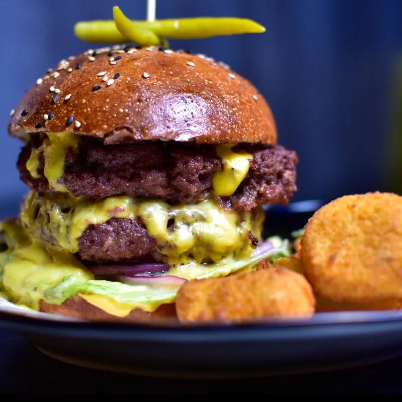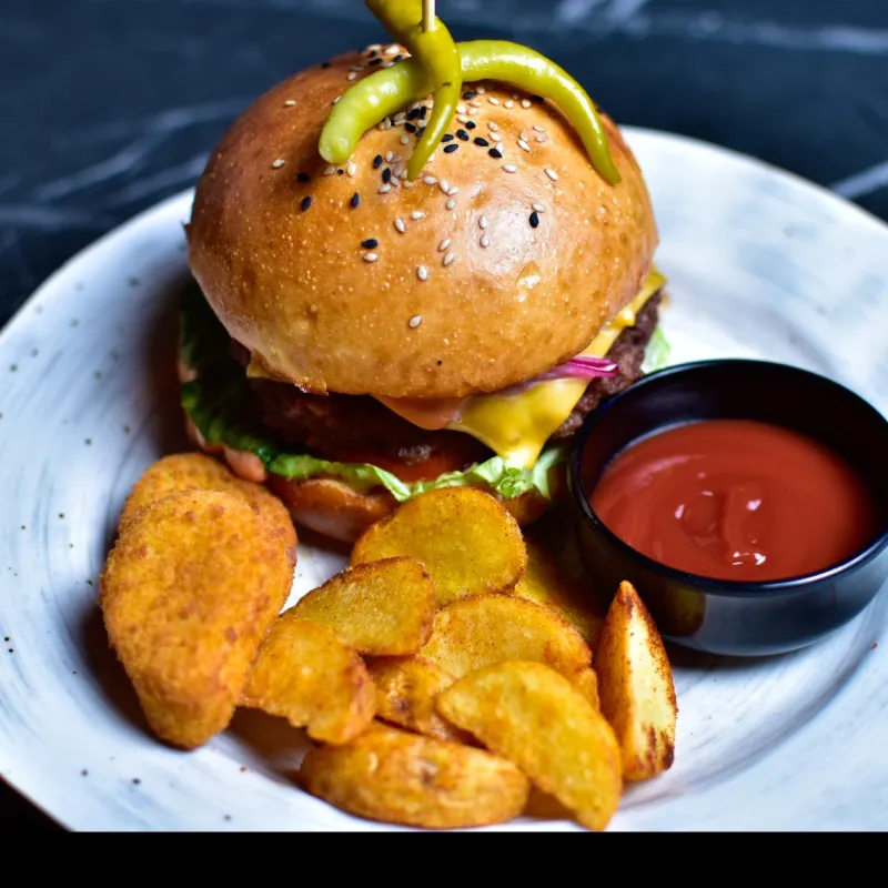 Булочка для бургера,соус кетчунез,котлета говяжий,сыр Чеддер,свежий огурцы,помидоры,айсберг,картофель фри,кетчуп