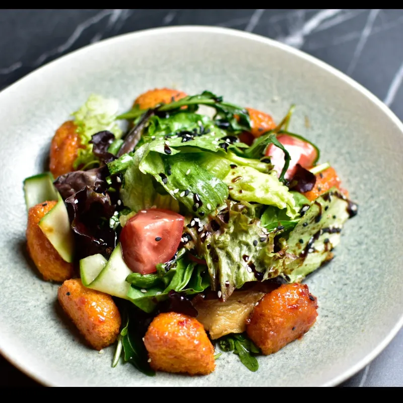 (микс салата, свежие овощи, куриные наггетсы, жареные баклажаны, соус sweet chili)