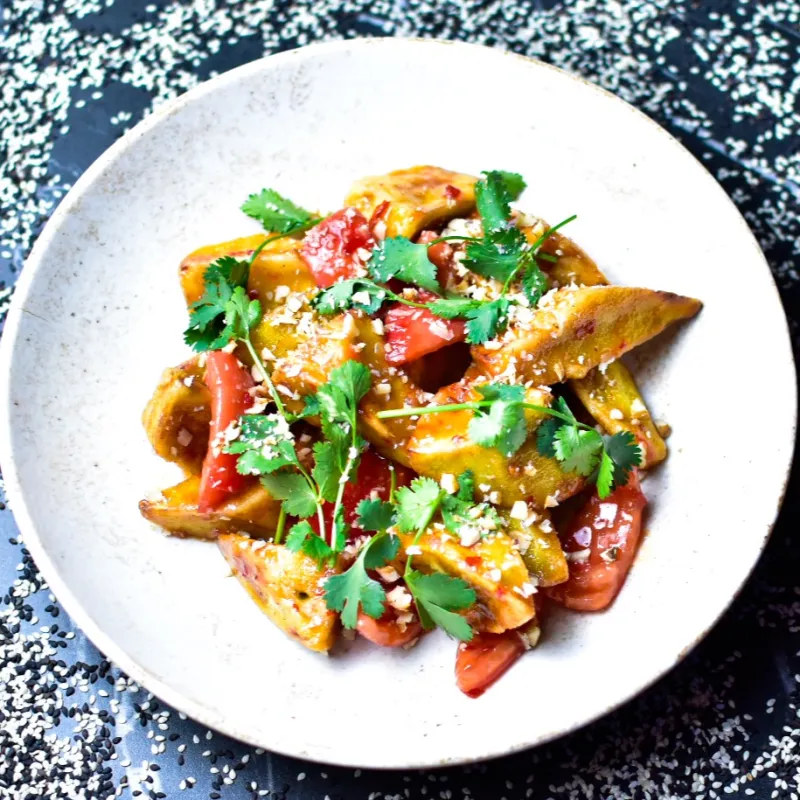 Всеми любимый салат с хрустящими баклажанами и сочными помидорами в кисло сладкой заправке