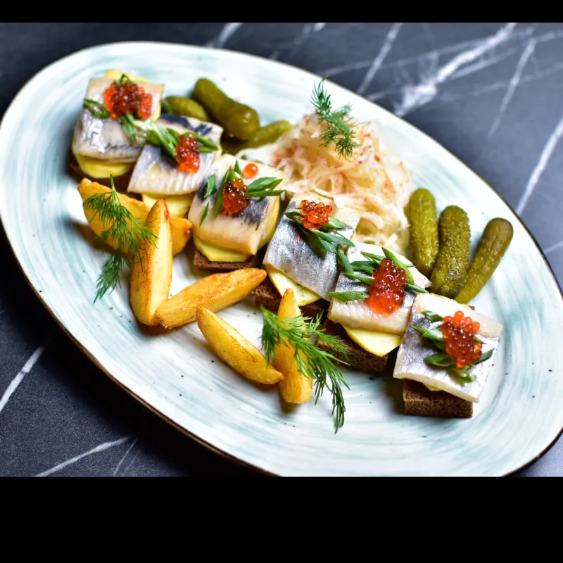 (Селедка,запеченный картофель,репчатый лук,корнишоны,хлеб бородинский)
