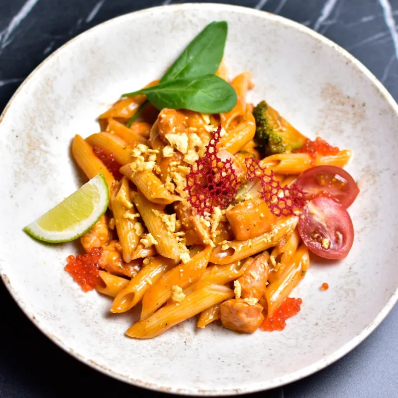 (Паста Пенне,норвежский лосось,сливки,брокколи,томатный соус,пармезан)