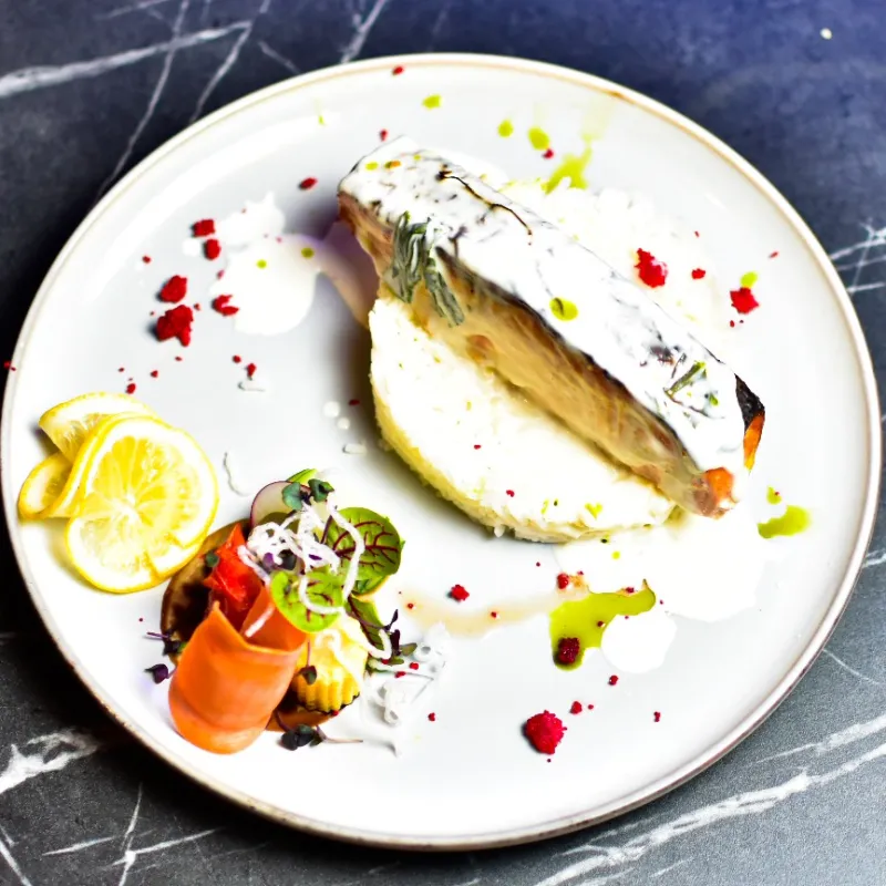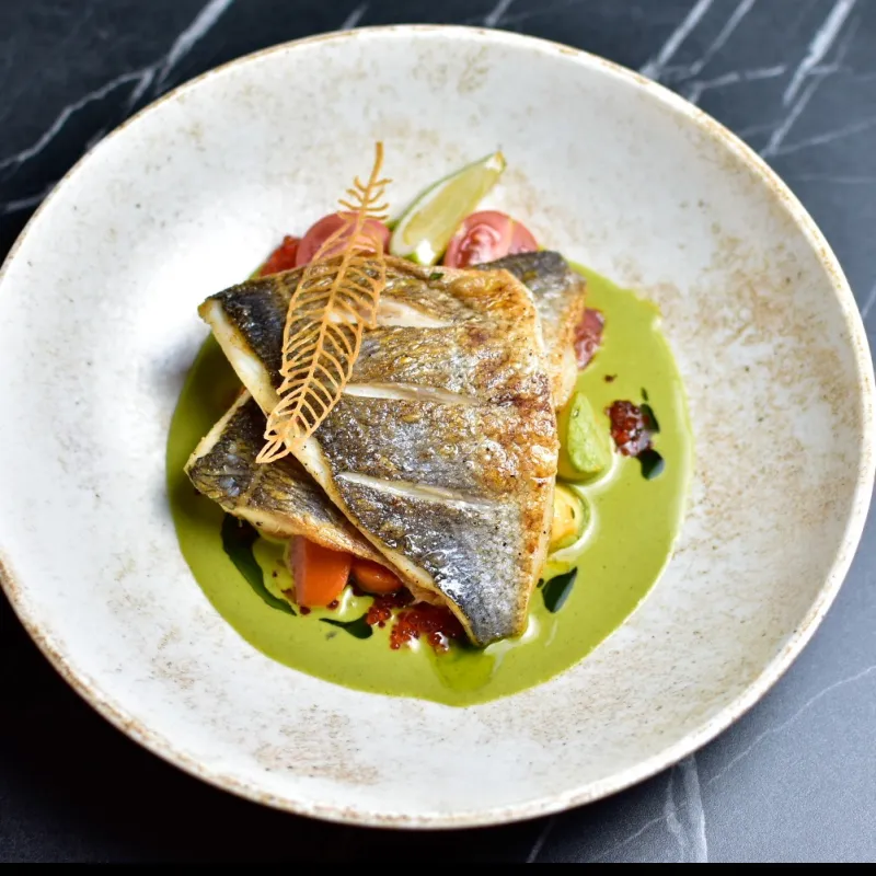 (Филе Атлантического дорадо,соте из свежих овощей,с пикантным соусом из петрушки)