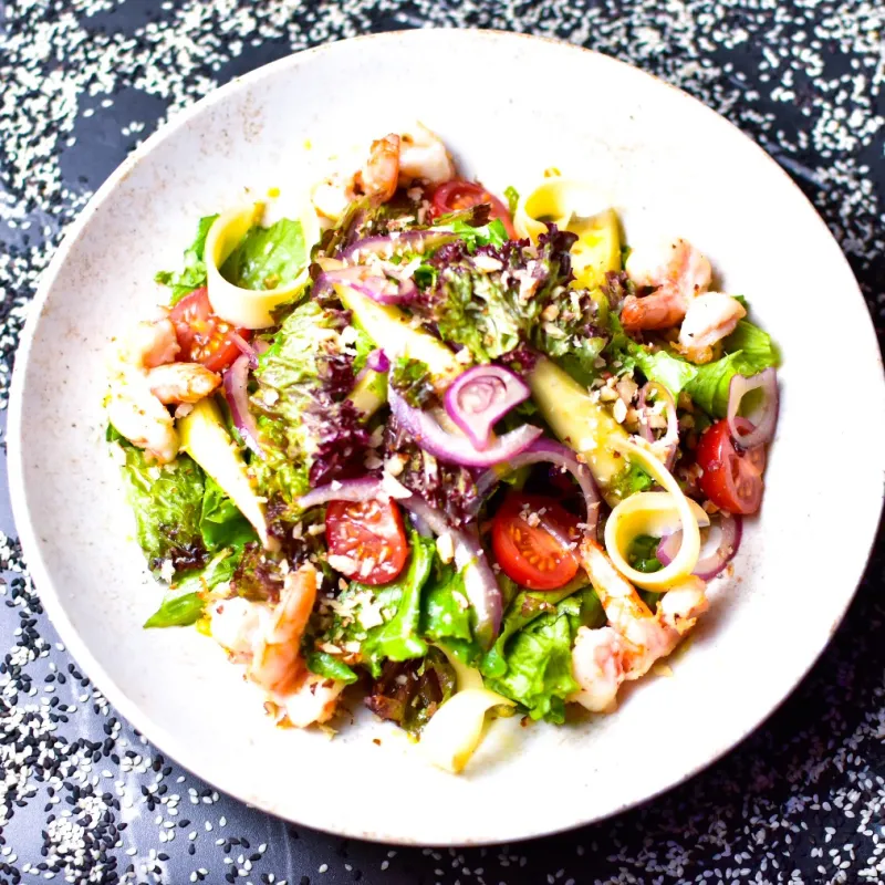 Фреш салат на основе свежих овощей и зелени с добавлением тигровых креветок заправленный бальзамическим дрессингом