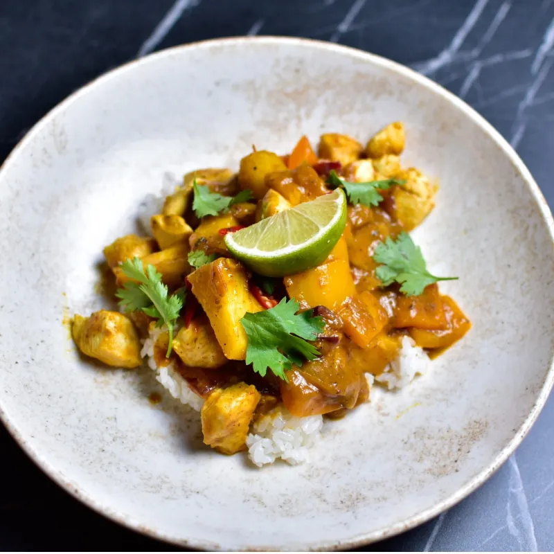 Куриное филе,болгарский перец,лук красный,чеснок,паста карри,рис басмати,,апельсин,зелень,сливки,кокосовое молоко,чёрный перец,вегета