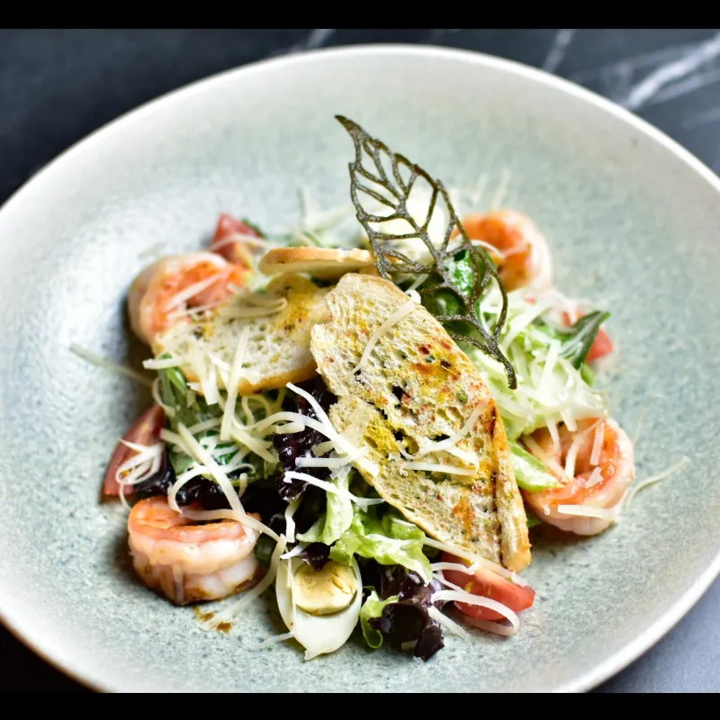 (Айсберг, помидоры Черри, пармезан, тигровые креветки, заправленный фирменным соусом)