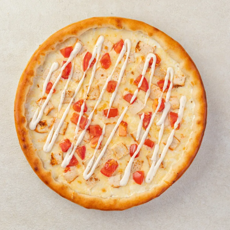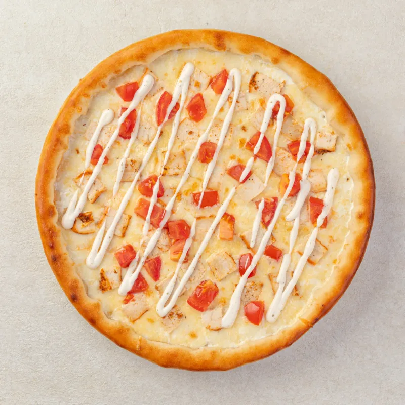 Сливочный соус, запечённая курица, помидоры, сыр моцарелла и соус ранч