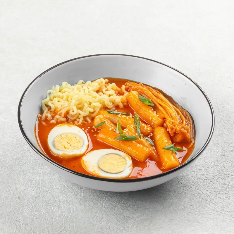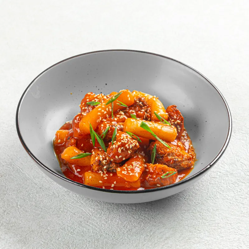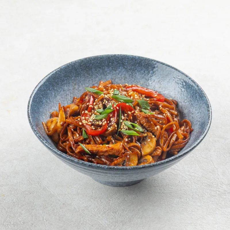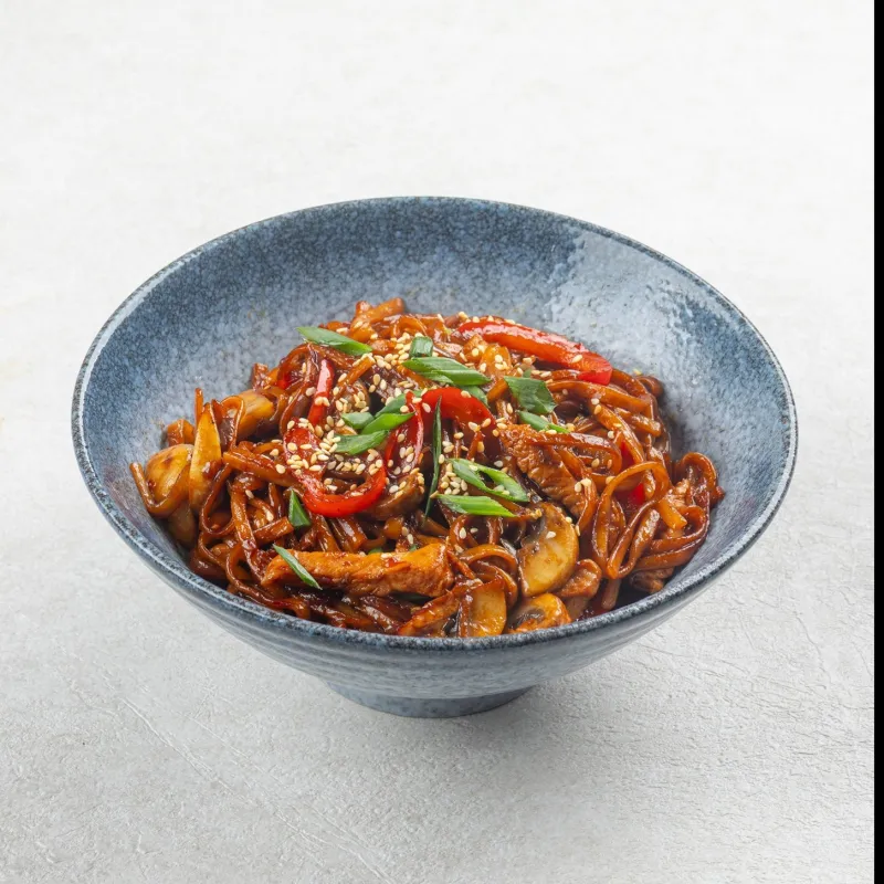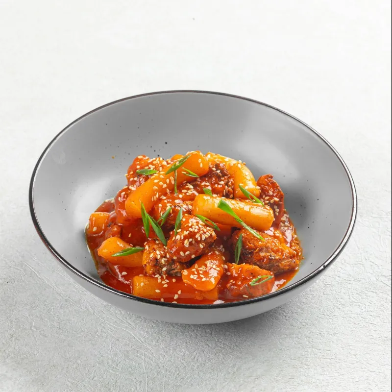 Корейские рисовые палочки в пряном соусе с кусочками сочной курицы, зелёным луком и кунжутом