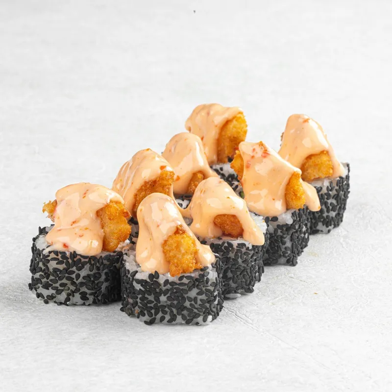 Креветка темпура, сыр филадельфия, огурец, чёрный кунжут, фирменный соус яссай