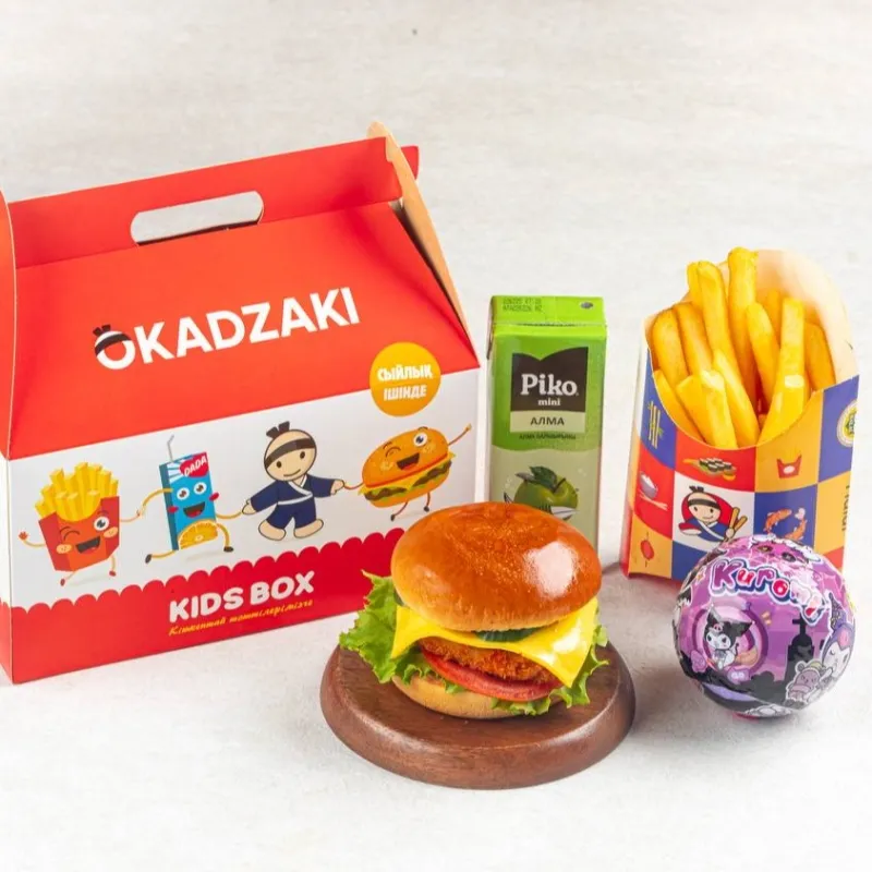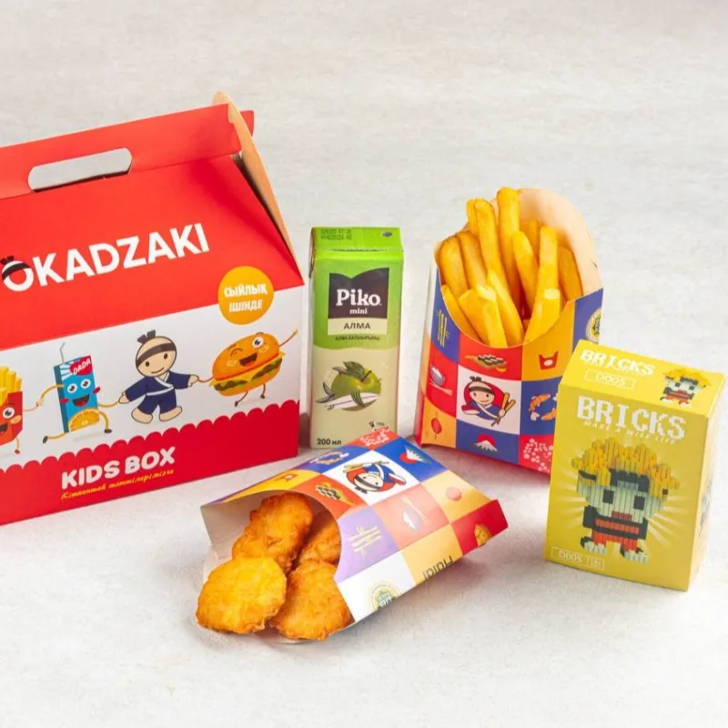 Наггетсы, фри, сок, кетчуп, игрушка.