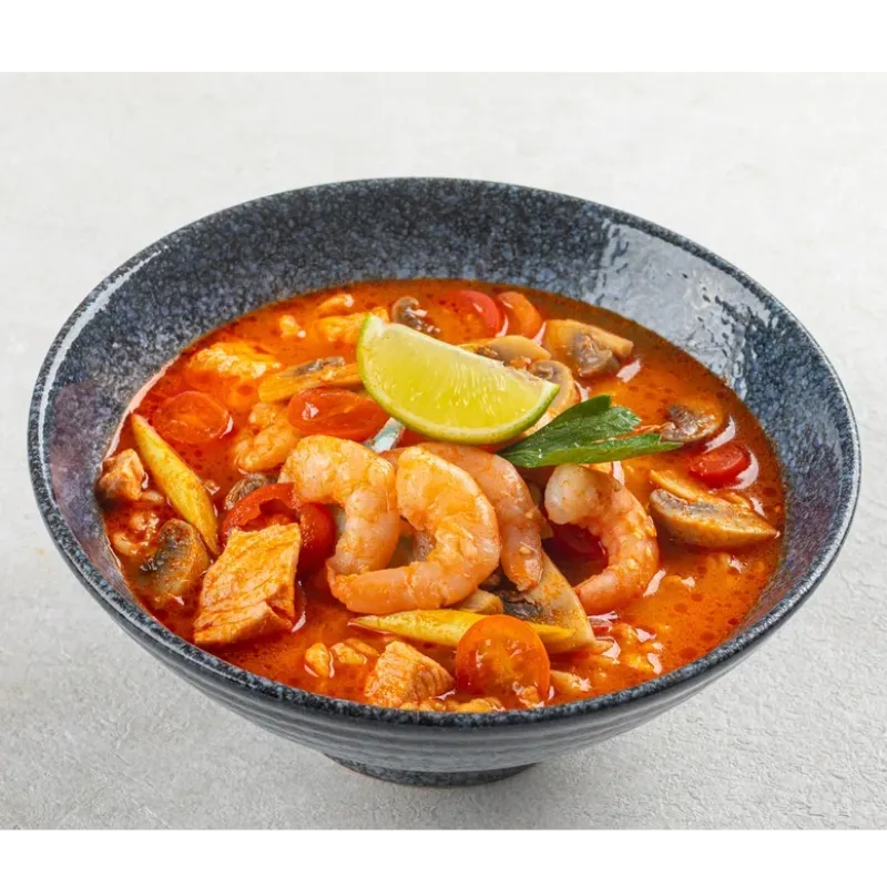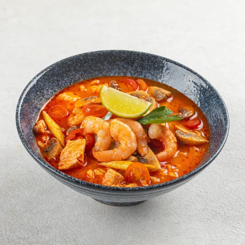 Паста том ям, лайм, имбиря и лемонграсс, грибы, помидоры черри, подаётся с рисом, начинка на выбор