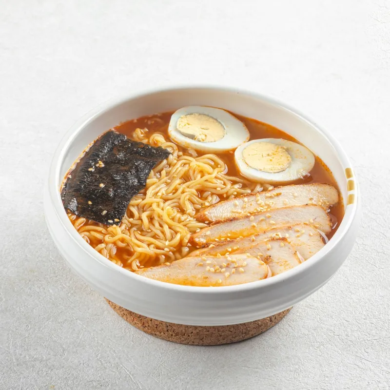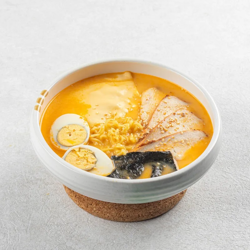 Рисовые палочки в остром соусе, в составе лапша, грибы эноки, отварное яйцо, кунжут, зелёный лук