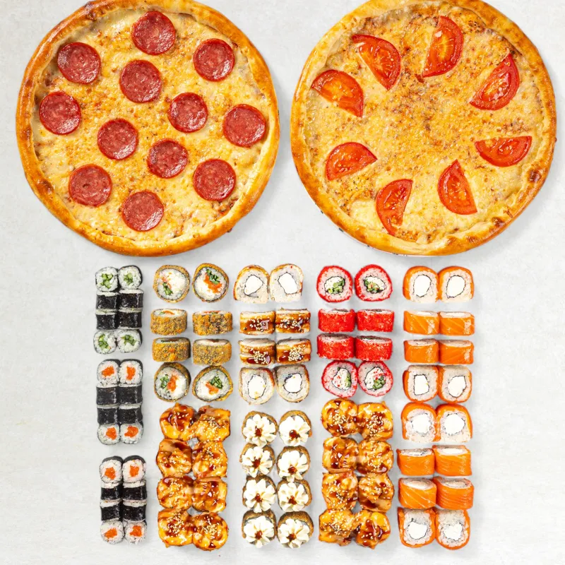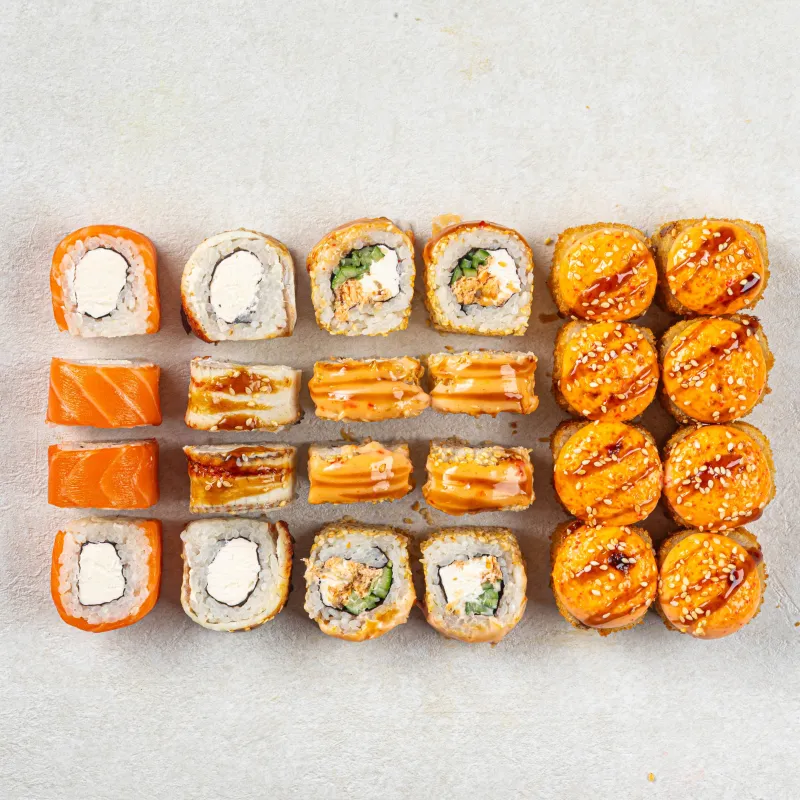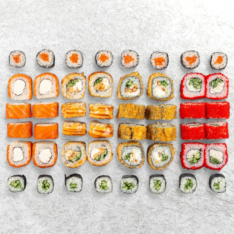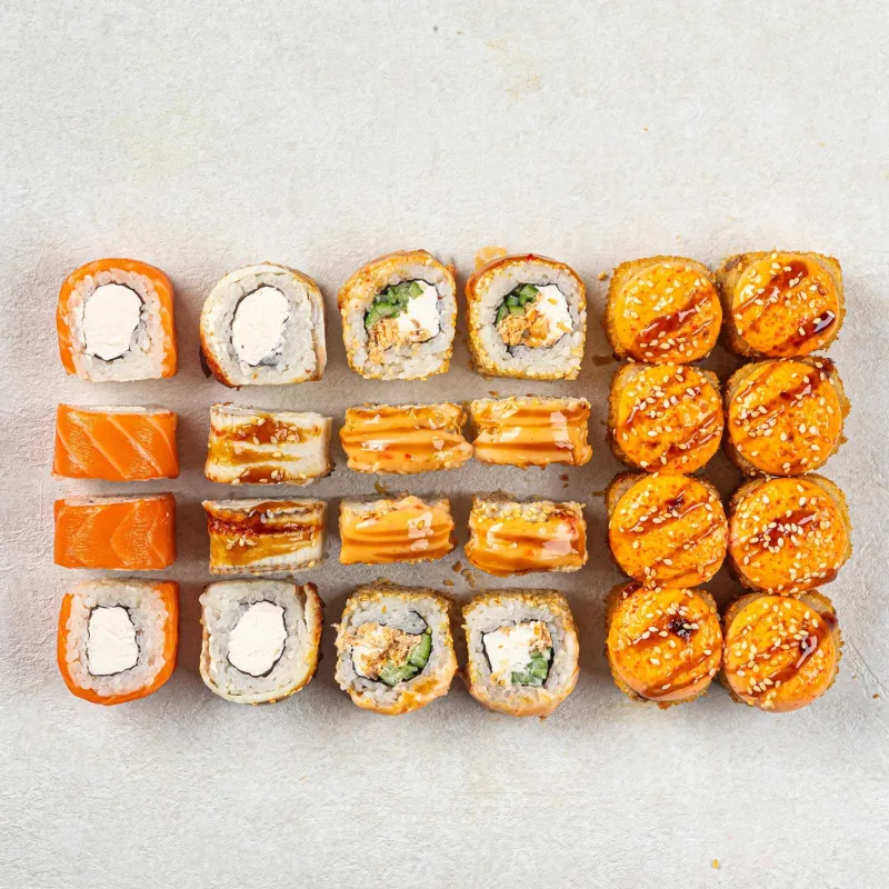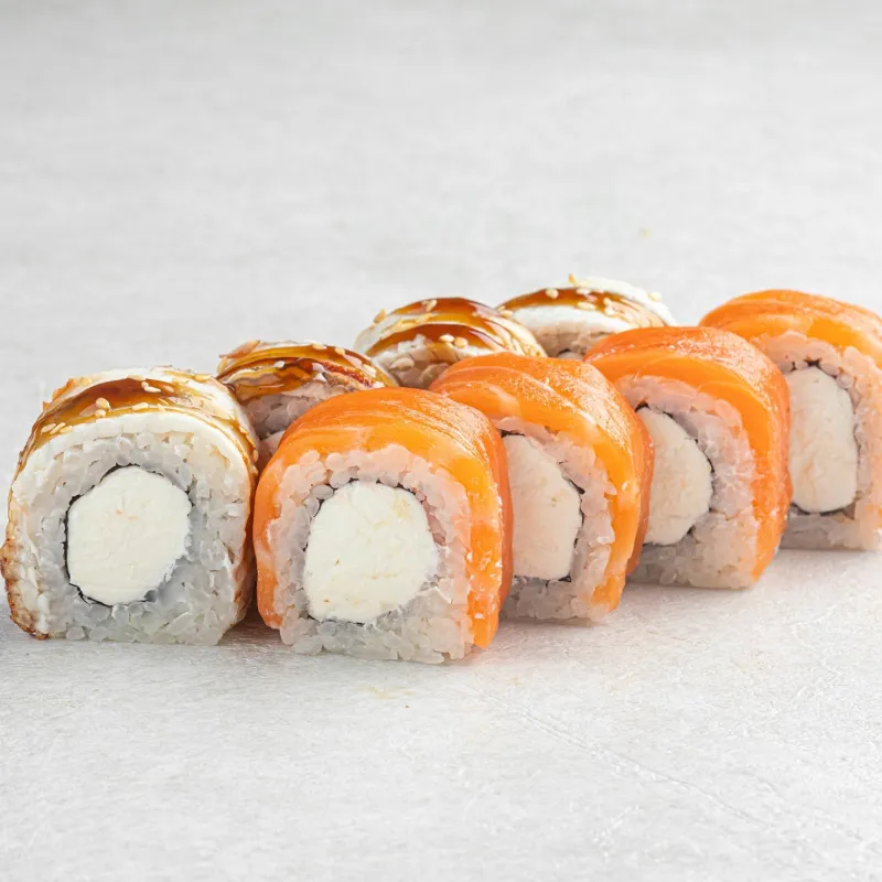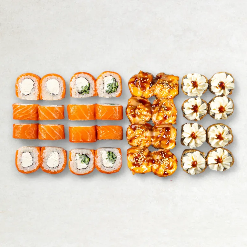 Филадельфия - 8 шт, Филадельфия - 8 шт, Канада - 8 шт, Калифорния - 8 шт, Лосось темпура - 8 шт, Яссай темпура с лососем - 8 шт, Итальяно темпура - 8 шт, Яссай темпура с курицей - 8 шт, Саки маки - 8 шт, Саки маки - 8 шт, Капа маки - 8 шт