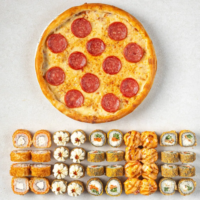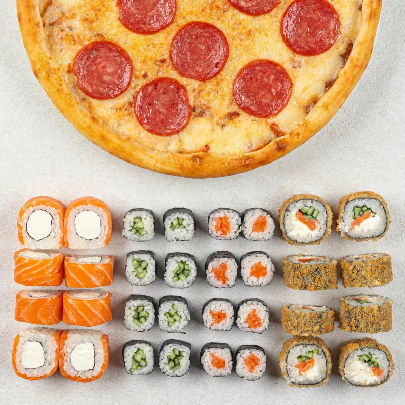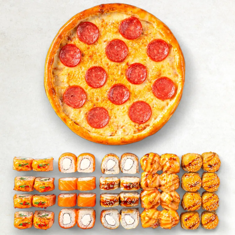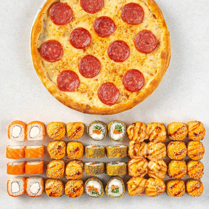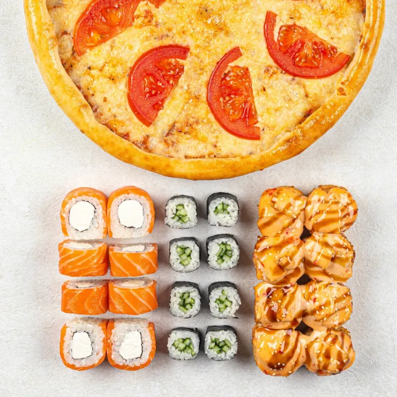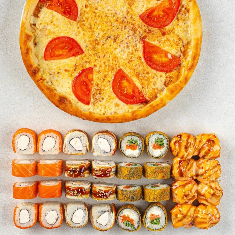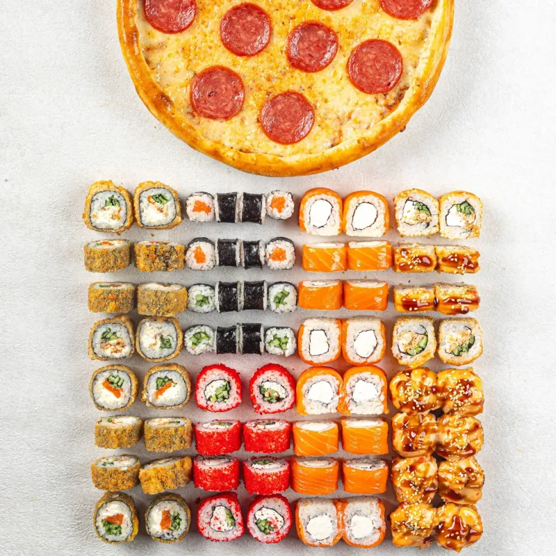 Филадельфия - 8 шт, Филадельфия - 8 шт, Канада - 8 шт, Калифорния - 8 шт, Лосось темпура - 8 шт, Яссай темпура с лососем - 8 шт, Итальяно темпура - 8 шт, Яссай темпура с курицей - 8 шт, Саки маки - 8 шт, Саки маки - 8 шт, Капа маки - 8 шт