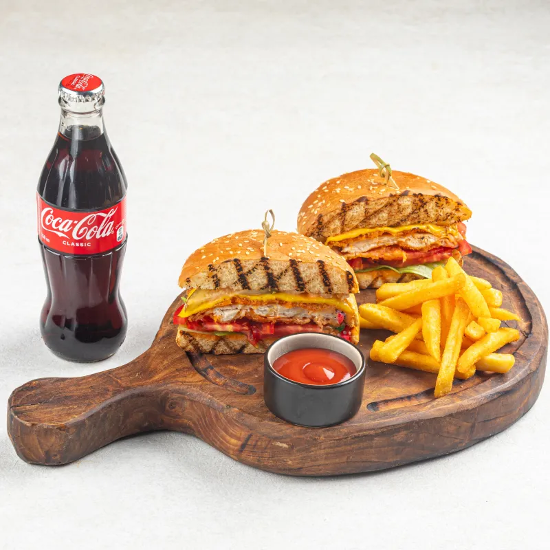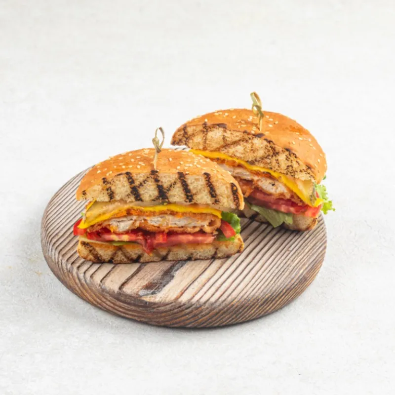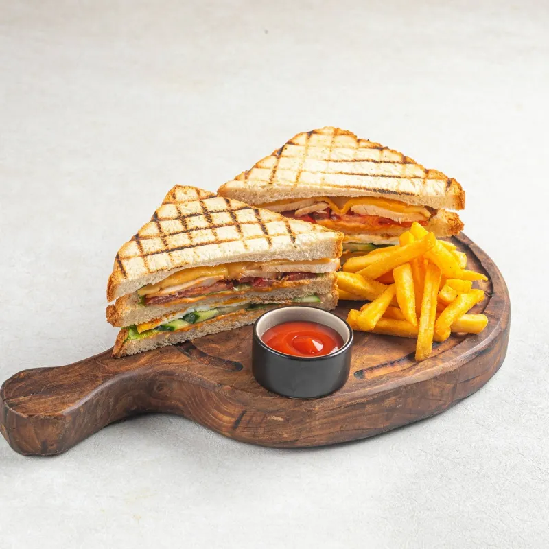 Трёхслойный сэндвич с курицей, сыром, свежими овощами и соусом, обжаренный на гриле. Подаётся с картофелем фри и кетчупом