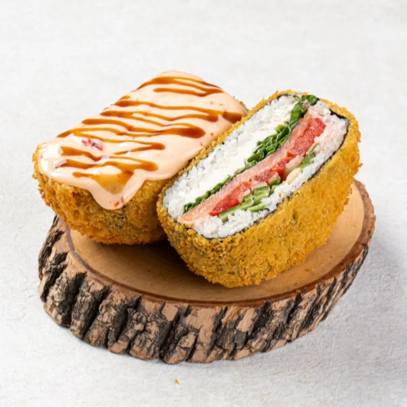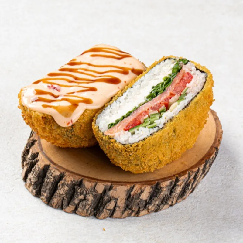 С курицей: Рис в хрустящем нори, айсберг, огурцы, сливочный кремчиз, ломтик сыра, помидор, соусы унаги и яссай, запечённая курица. С креветками: Рис в хрустящем нори, свежий лист салата, снежный краб, икра тобико, сливочный кремчиз, соусы унаги и яссай, жареные креветки. С копчёной семгой: Рис в хрустящем нори, сливочный кремчиз, свежий лист салата, огурцы, помидор, соусы унаги и яссай, копчёная семга.