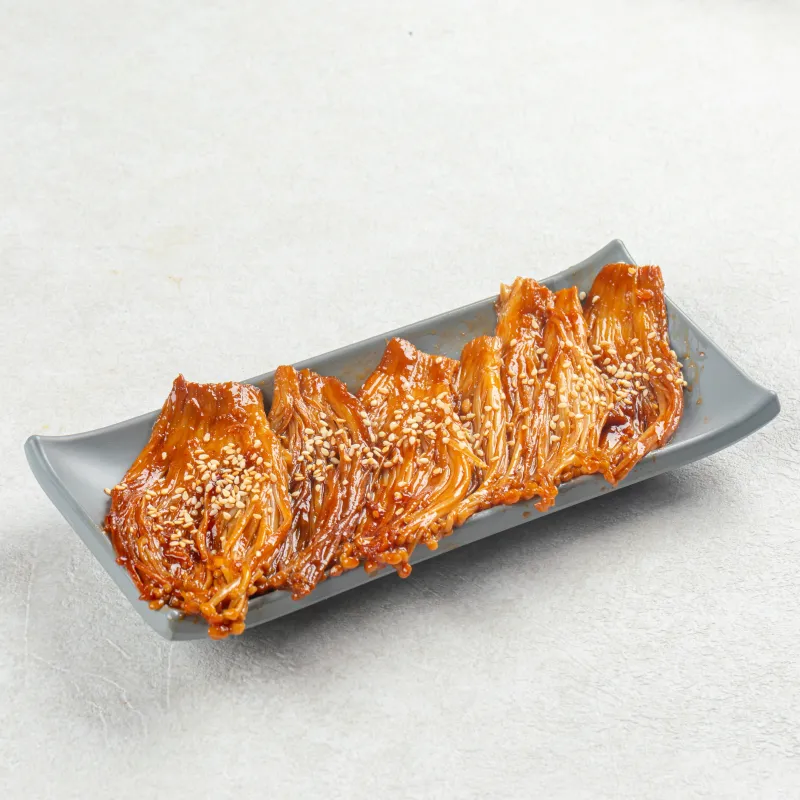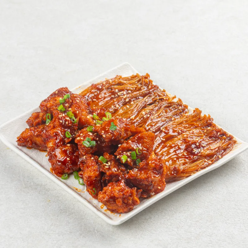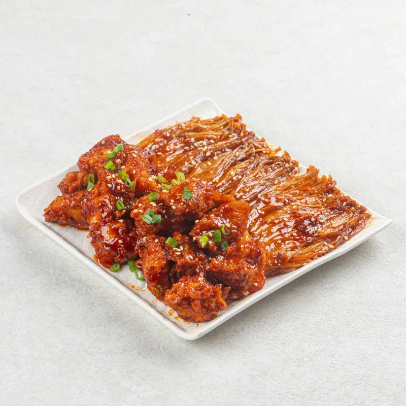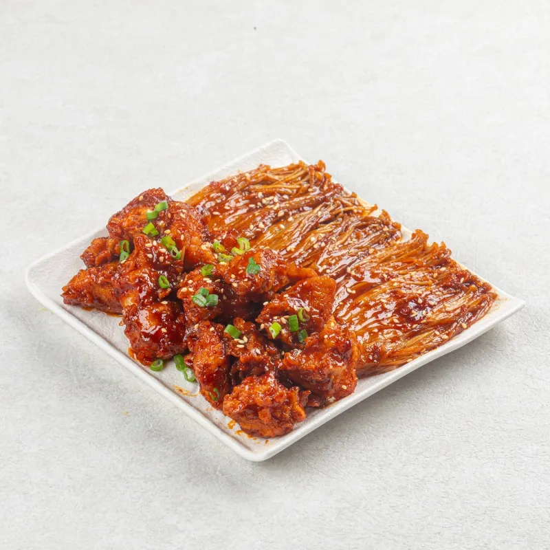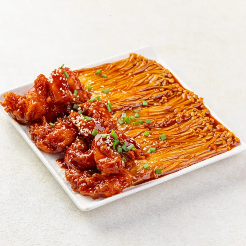 Аппетитное сочетание хрустящих эноки-грибов и курицы в остром корейском соусе. Яркий вкус, насыщенный аромат и оригинальная подача