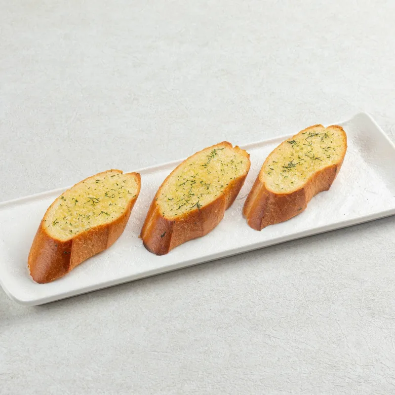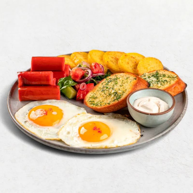 Глазунья, охотничьи колбаски, картофель, чесночный хлеб, свежий салат, белый соус