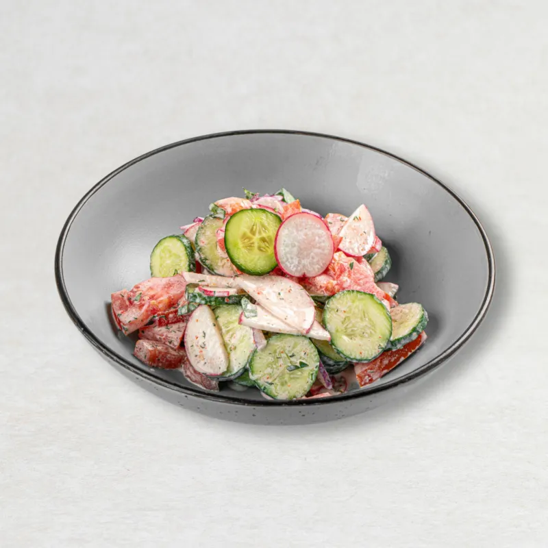 Помидоры, огурцы, редис, красный лук, зелень, сметана