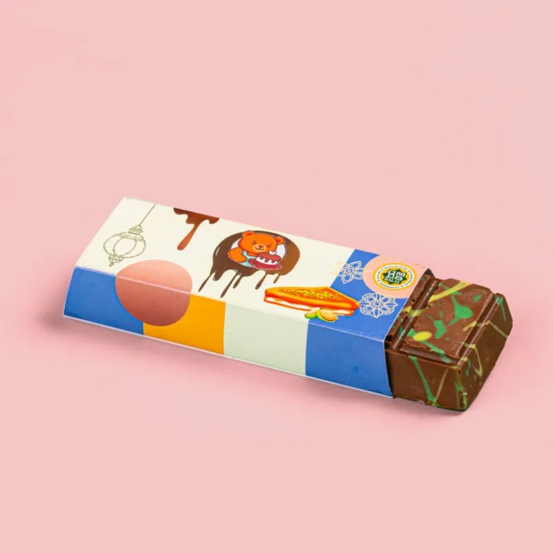 Молочный бельгийский шоколад в сочетании с нежной фисташковой пастой и хрустящей начинкой из катаифи