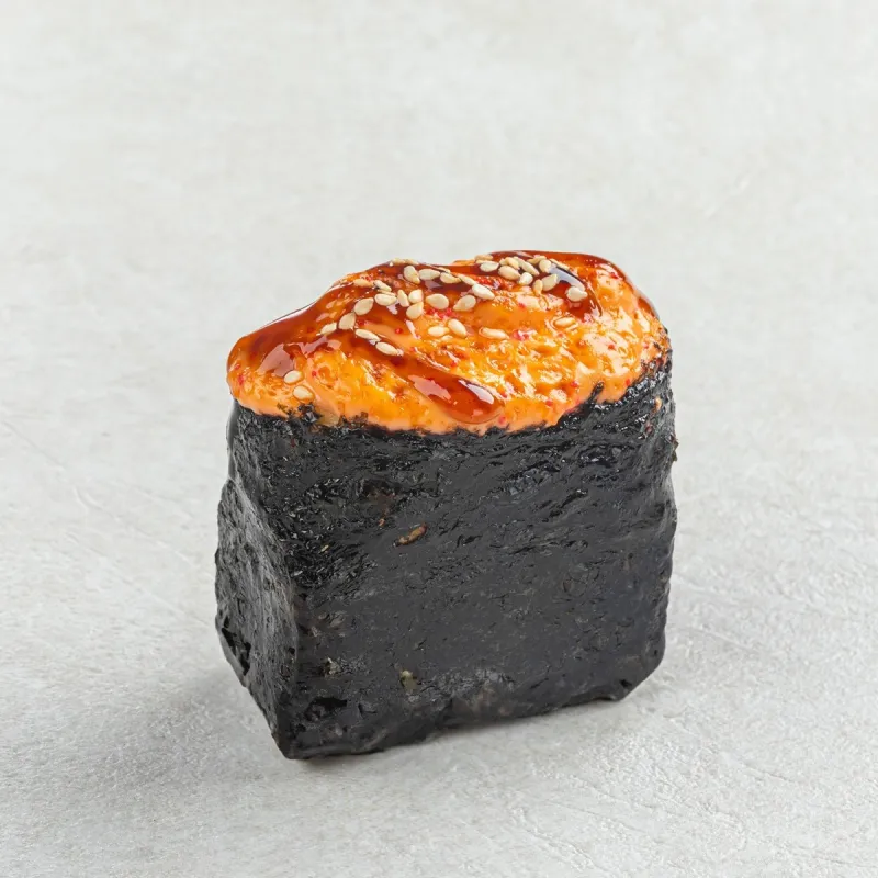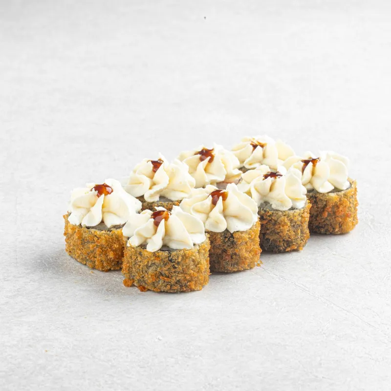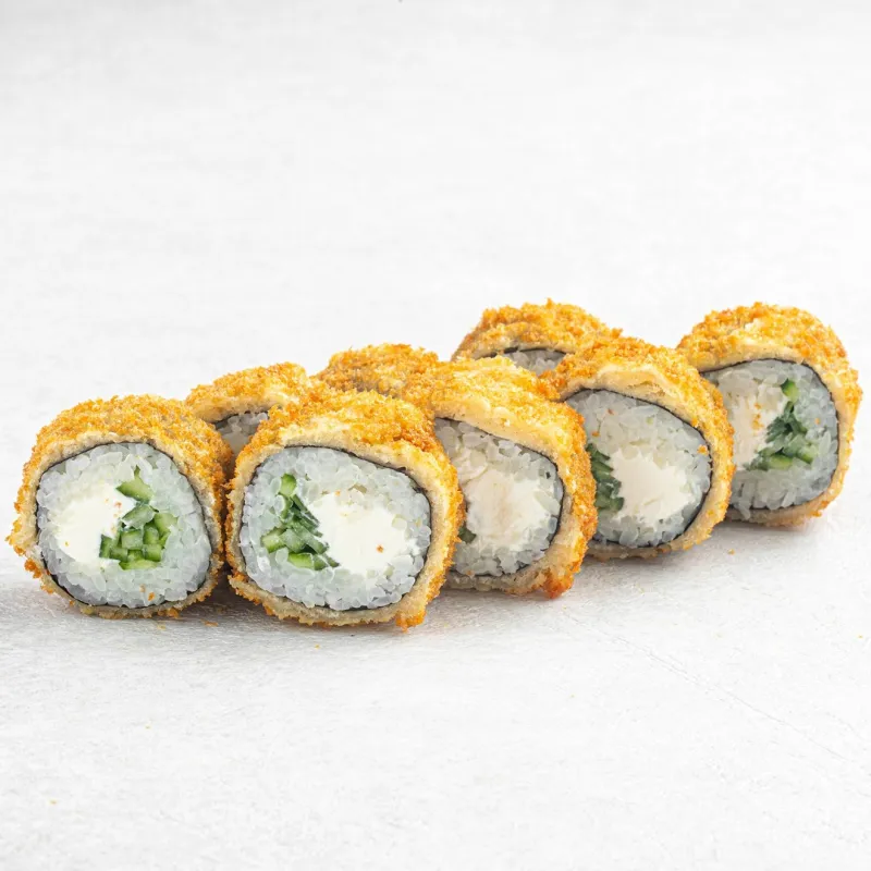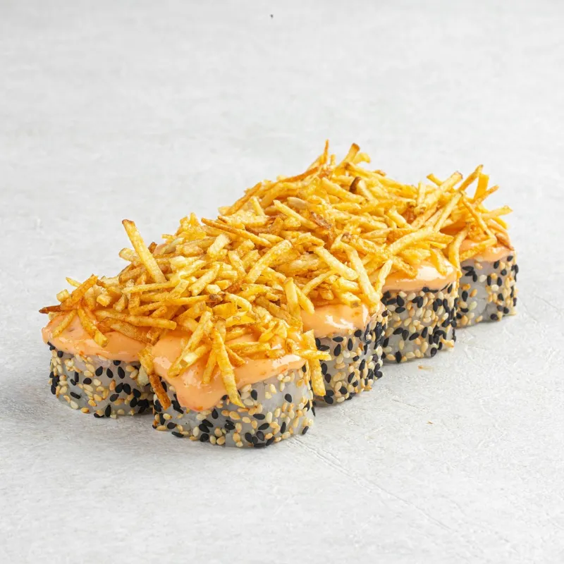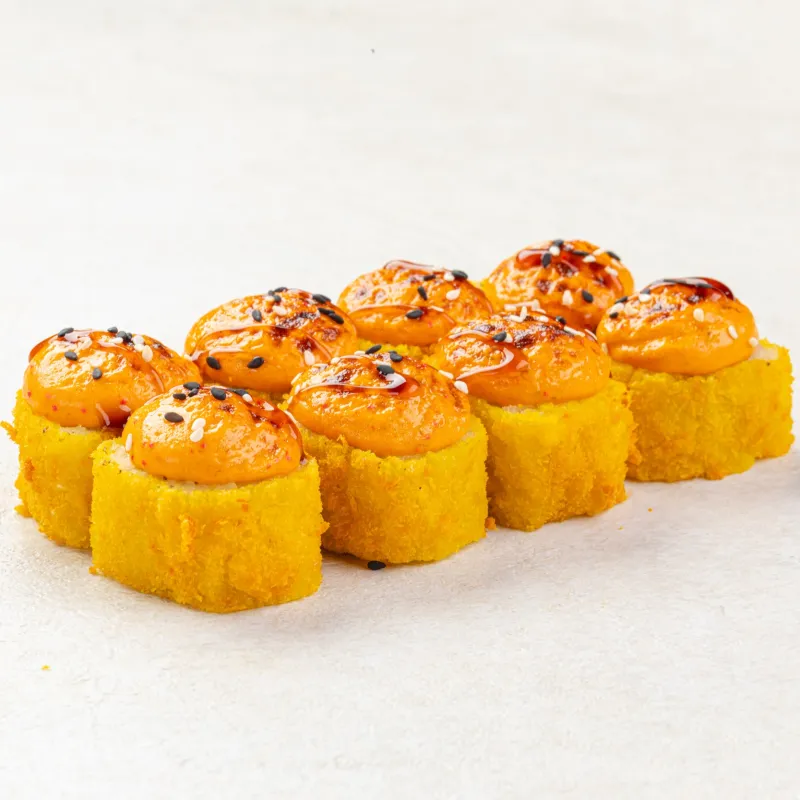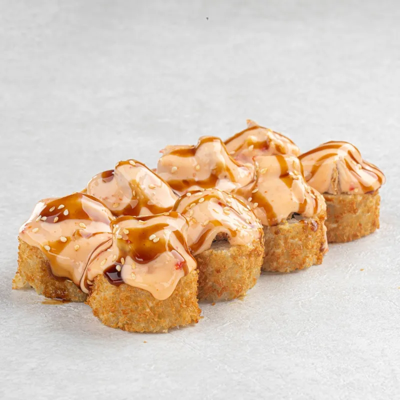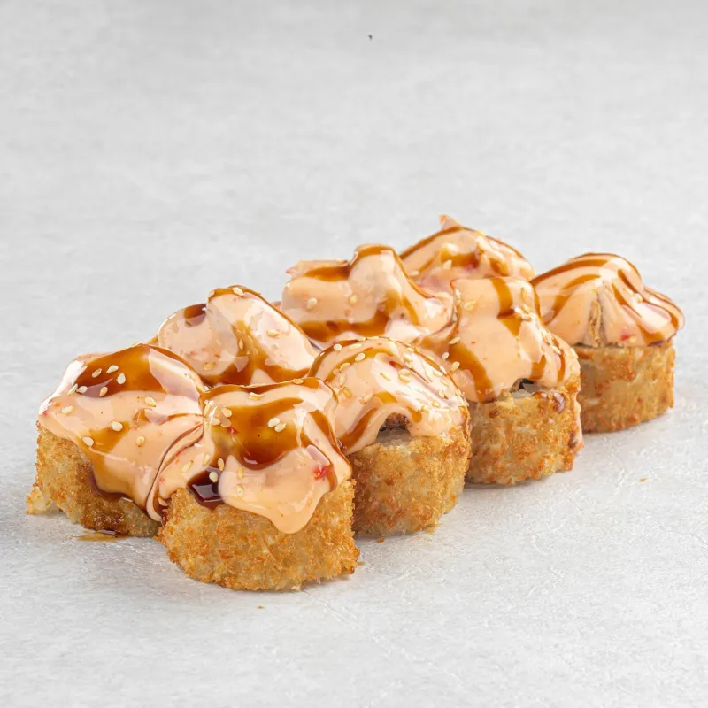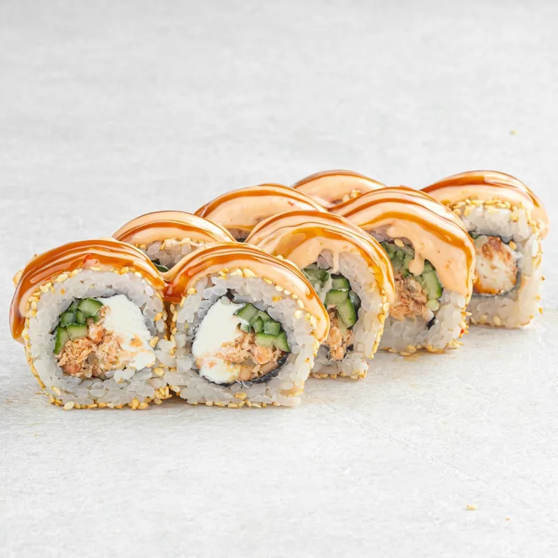 Сыр филадельфия, огурец, соус том ям и унаги. Посыпается кунжутом. Начинка на выбор