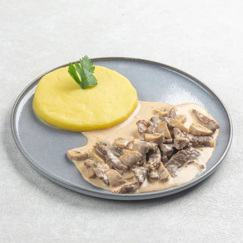 Нежные кусочки говядины с грибами в сливочном соусе, подаётся с гарниром на выбор: пюре/рис.