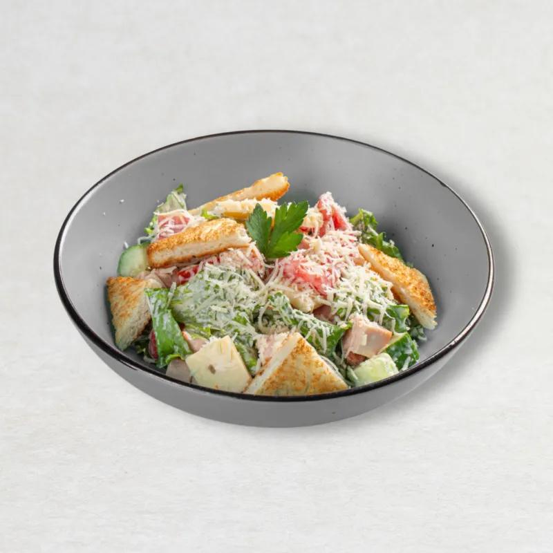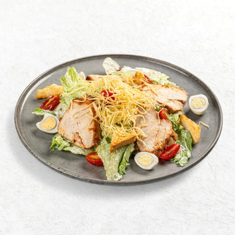 Запечённая курица, айсберг, перепелиные яйца, помидоры черри, соус цезарь, пряные сухари, пармезан
