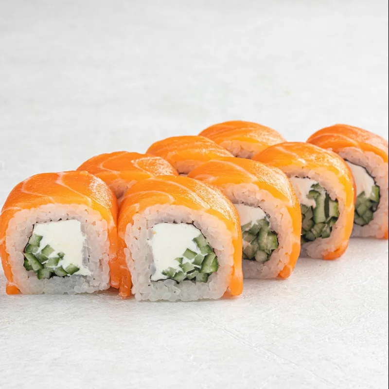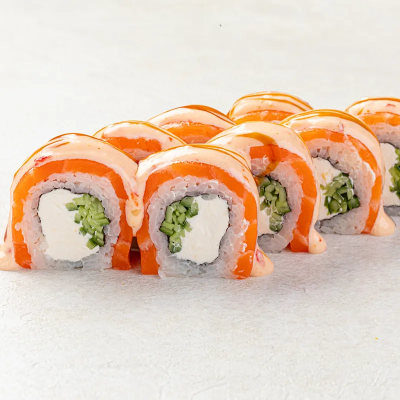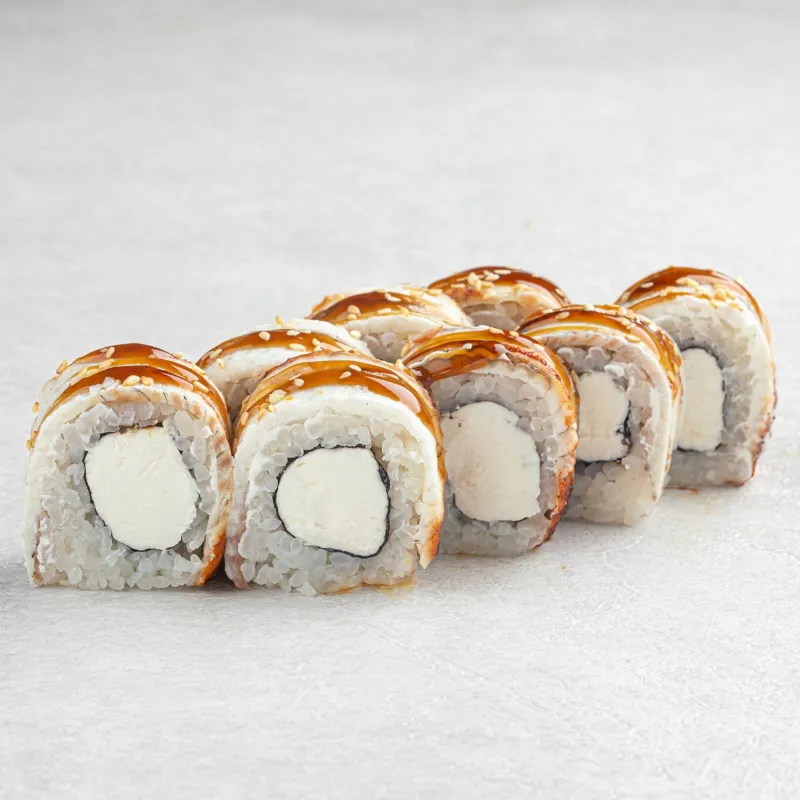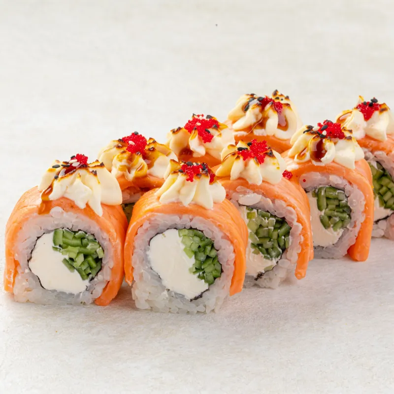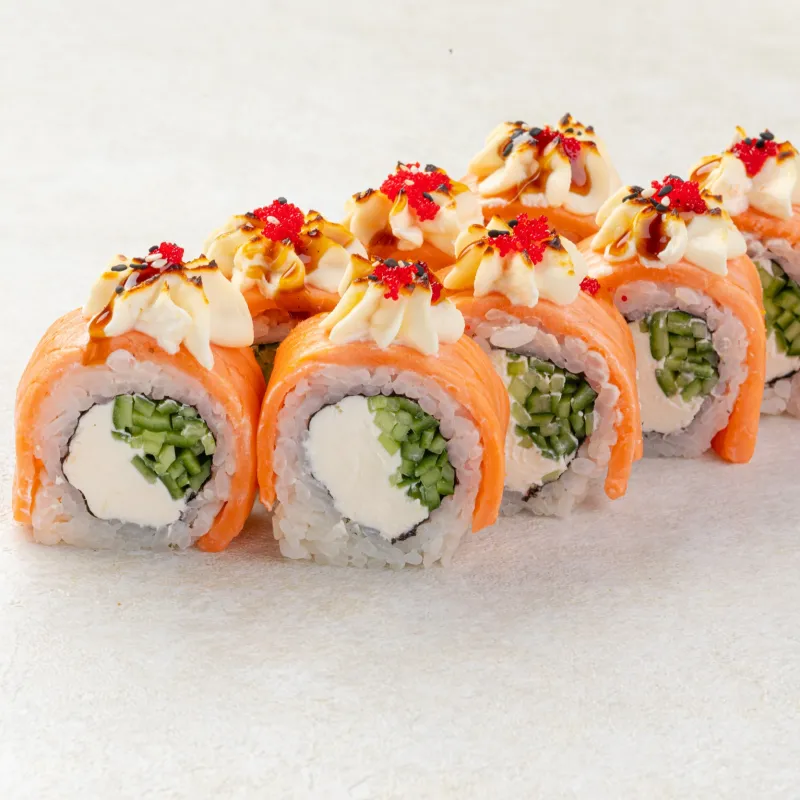 Сыр филадельфия, огурец, фирменный соус, кунжут, унаги соус