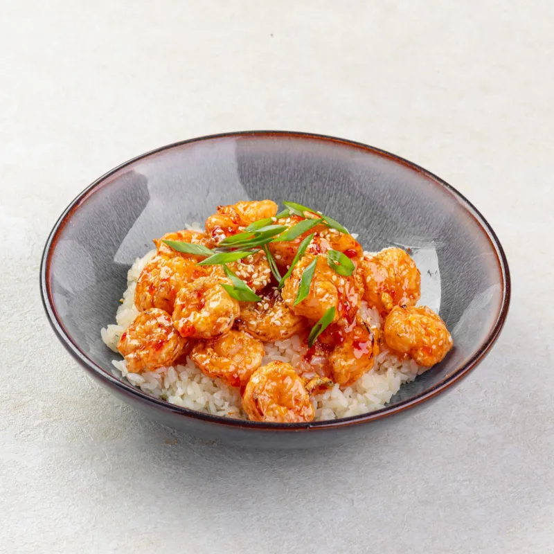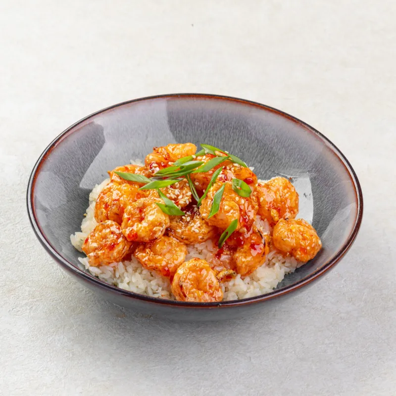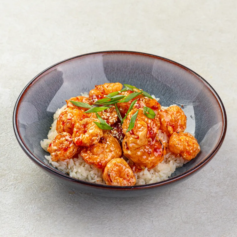 Креветки в хрустящем кляре, обжаренные в кисло-сладком соусе. Подаются с рисом, посыпаются зелёным луком и кунжутом