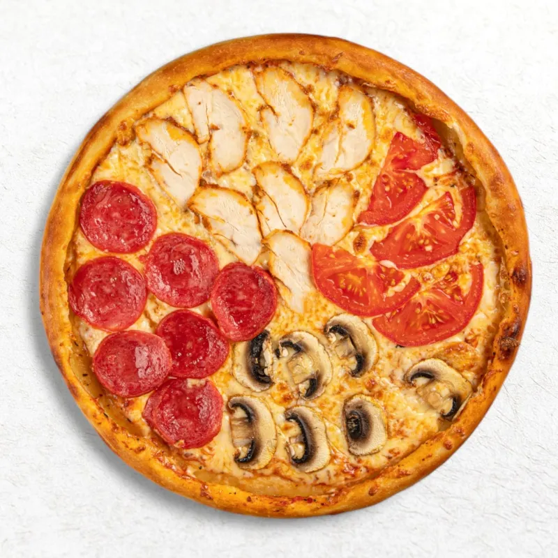 Томатный соус, колбаски, запечённая курица, помидоры, грибы, сыр моцарелла