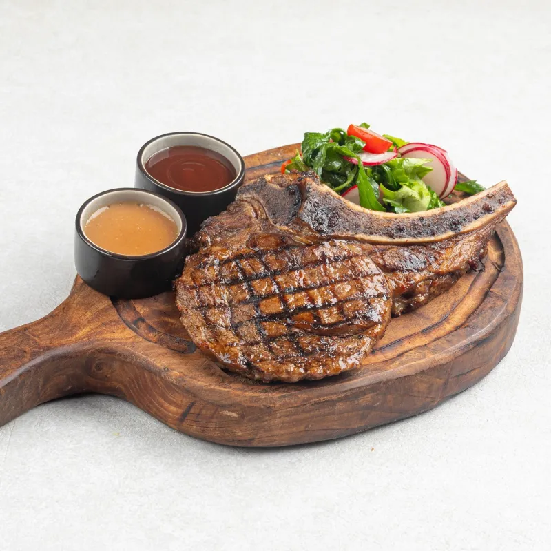 Сочный рибай на кости. Подаётся с микс салатом и соусами барбекю и демиглас